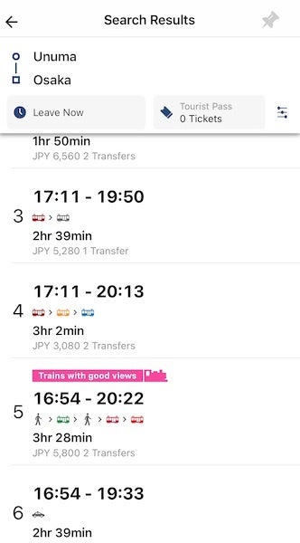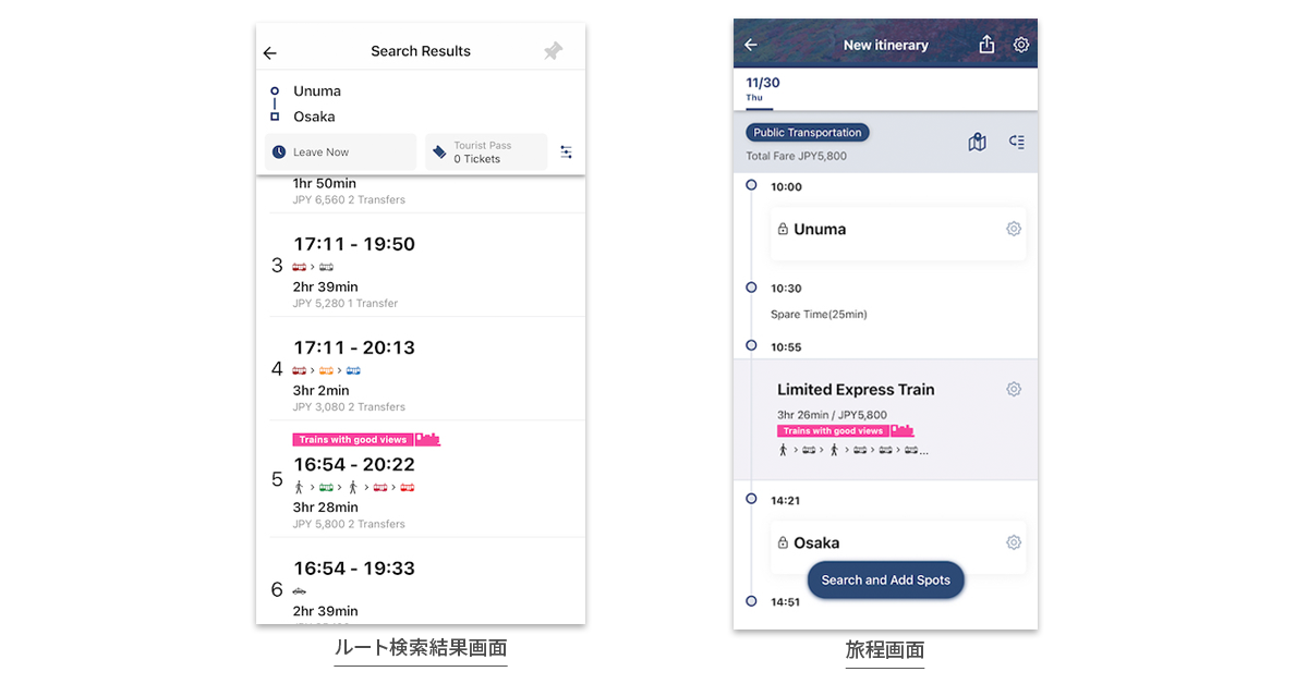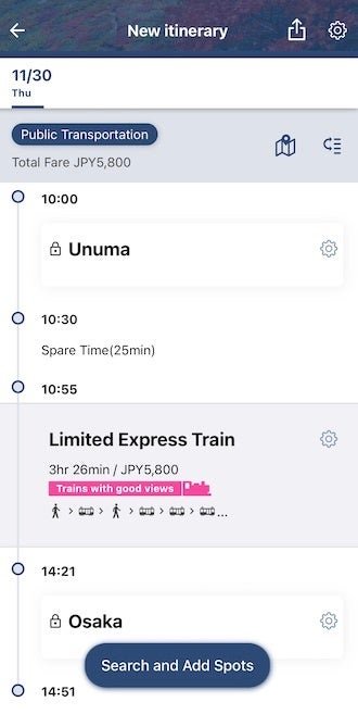 ユーザーによる設定は不要で、アプリ画面の「Route」タブで出発地/目的地/時刻などを設定してルート検索をし、該当ルートや区間がある場合に、「Sightseeing Train」ルートが表示されます。「itinerary」に組み込むこともできます。