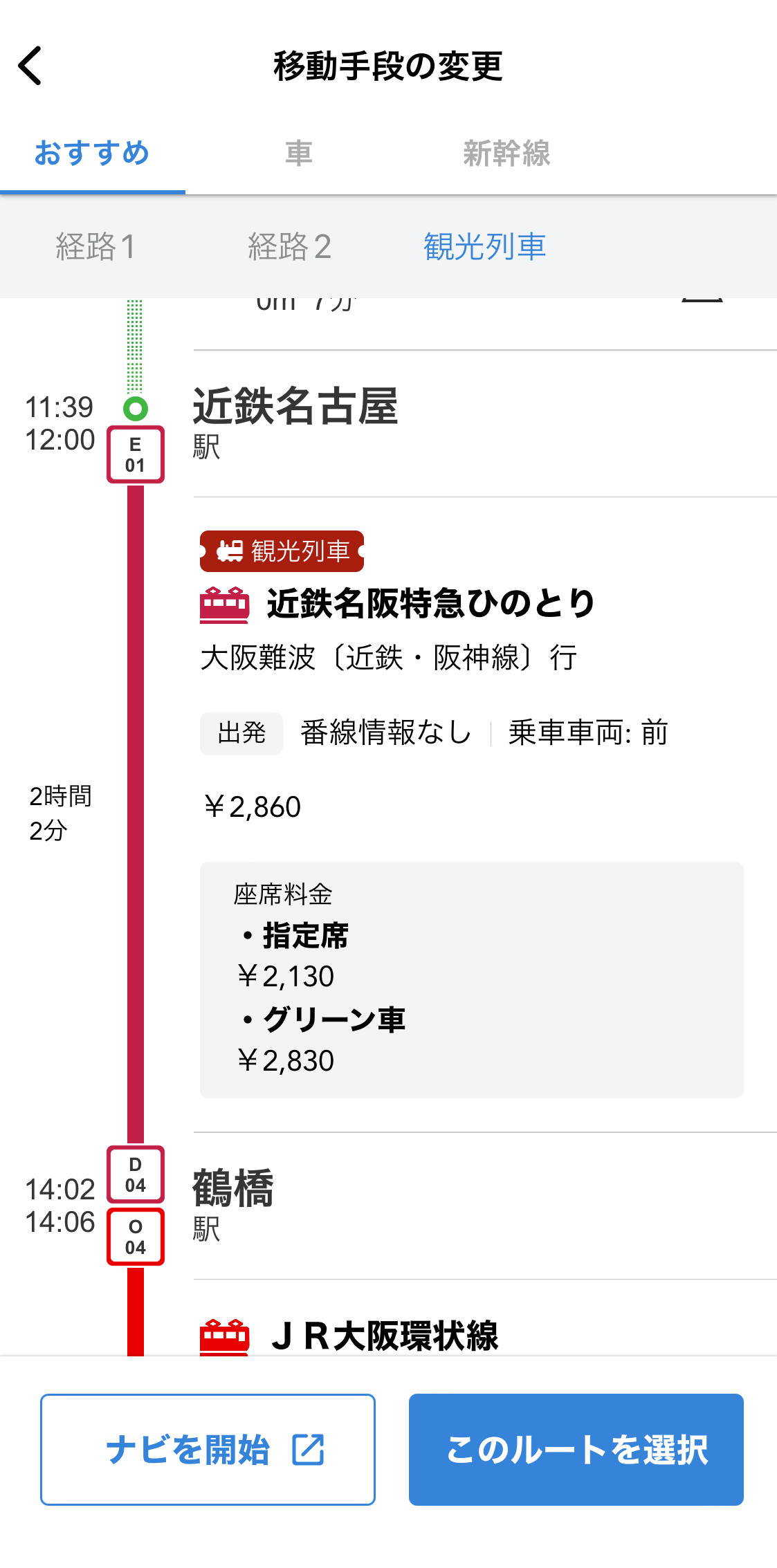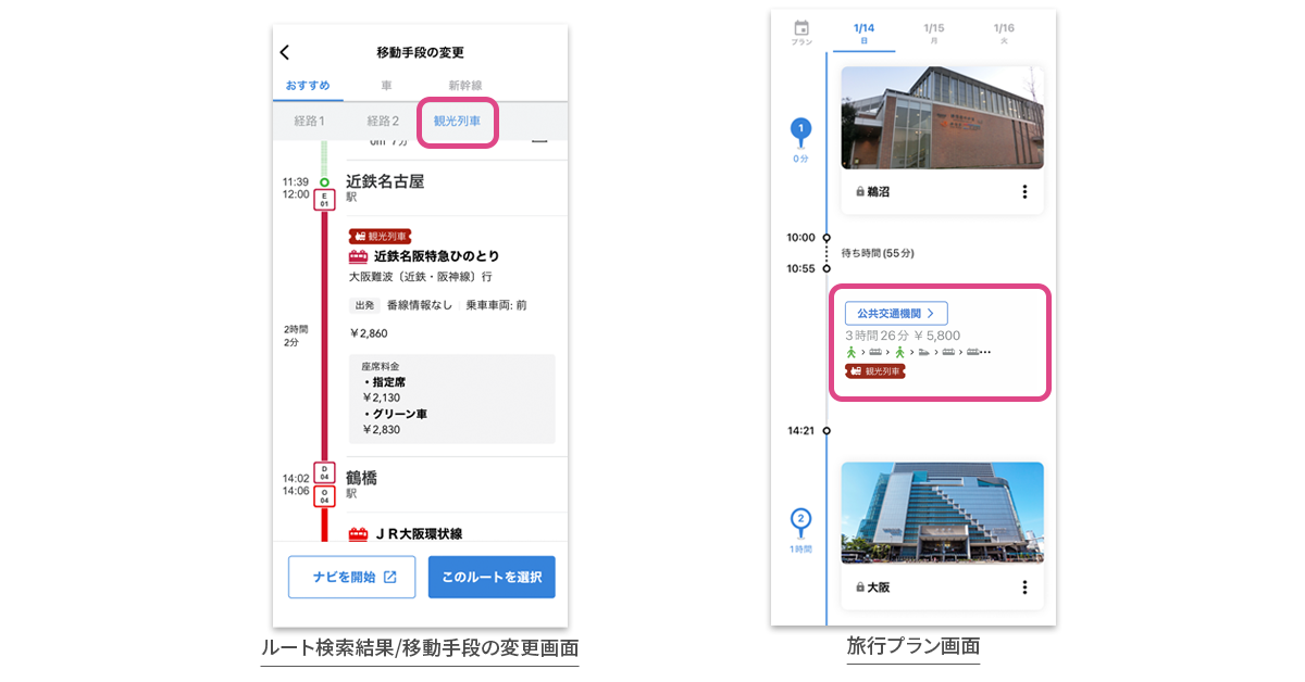 例えば、岐阜県にある鵜沼駅から大阪駅へ向かうルートを検索すると、通常推奨ルートでは、新幹線を使った経路が表示されますが、名古屋駅から大阪駅まで「観光列車」に乗るルートが選択肢として提示されます。観光列車を利用する前後のアクセスも、電車や車などの移動手段を組み合わせた最適な経路を提示します。複数移動手段を考慮した経路検索を提供する当社ならではの技術により、実現しています。また、「観光列車優先ルート」を利用した旅行計画を作成することもできます。
