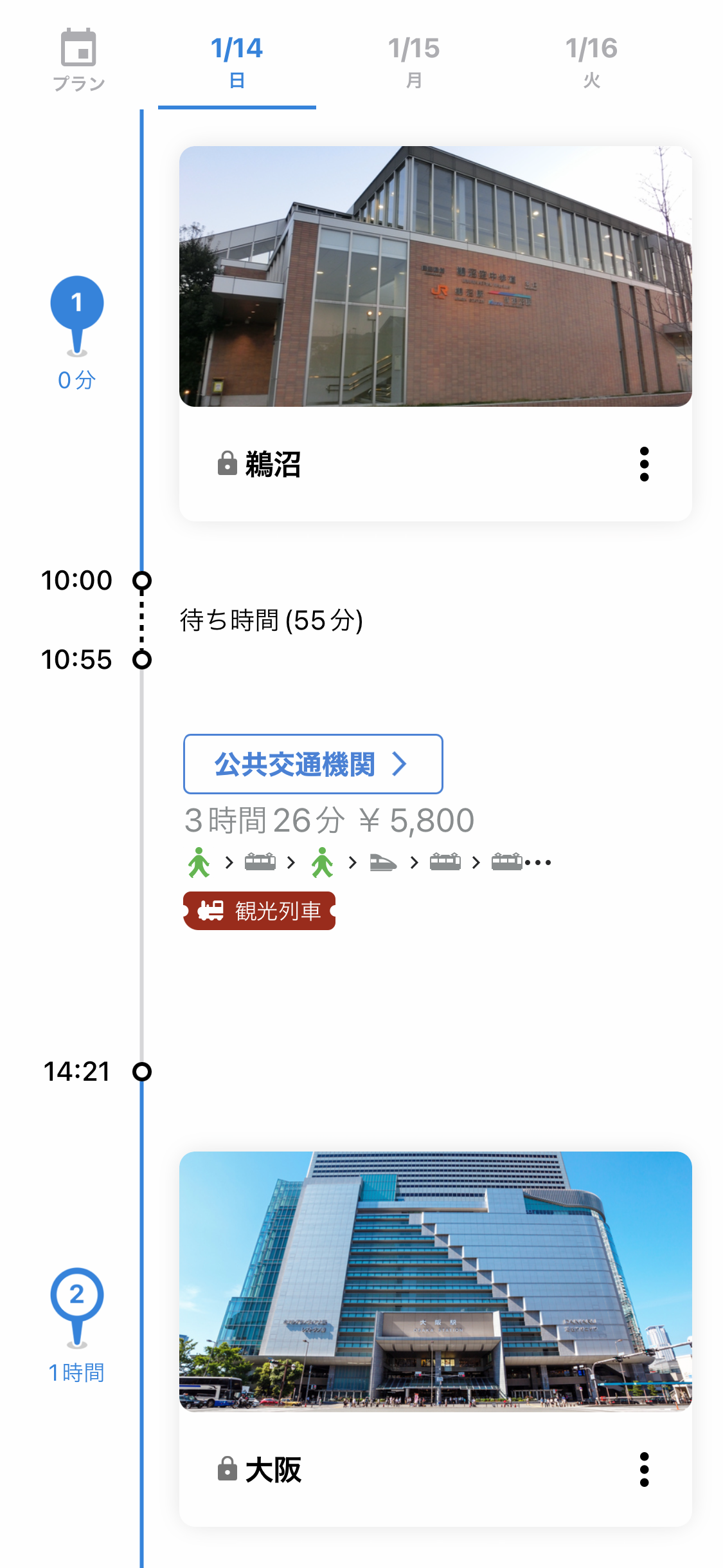 ユーザーによる設定は不要で、アプリ内の「計画する」タブから「旅行プラン作成」後に、スポット間のルートが検索されるので移動手段を変更したい区間をタップする。観光列車に乗るルートがある場合は一覧に表示されているので選択すると、「旅行プラン」に観光列車ルートが表示されます。