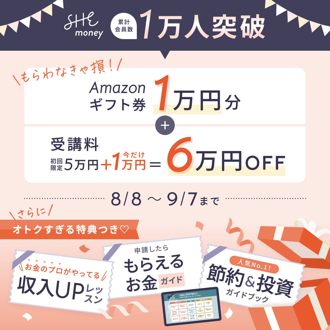 1万人達成を記念し、受講生だけでなく初めてSHEmoneyに関わるすべての方もSHEmoneyを楽しんでいただけるよう、お得なキャンペーンや無料イベントなどの特別企画を実施します。