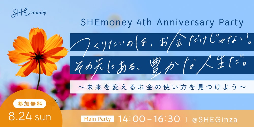 内容 |SHEmoney4周年を記念した会員向けのイベントです。「お金の使い方」をテーマに、人生と向き合う時間をお届けします。等身大のロールモデルによるBefore/Afterストーリーのシェアや、SHEmoneyで人気のTAとブランド責任者による、ここでしか聞けないお金と人生にまつわるスペシャルトークセッション&ワークを実施します。