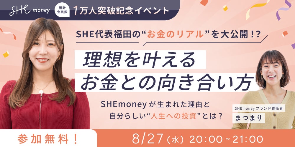 名称 |【SHEmoney会員数1万人記念イベント】SHE代表福田のお金のリアルを大公開!? 理想を叶えるお金との向き合い方