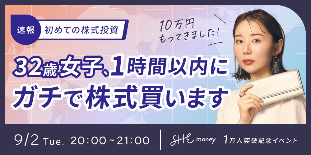 名称 |【SHEmoney会員数1万人記念イベント】\はじめての株式投資/32歳女子、1時間以内にガチで株式買います!