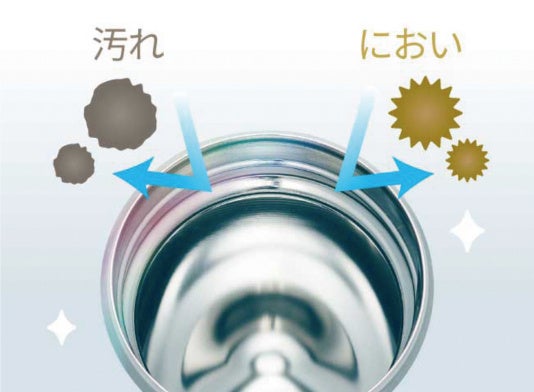 ボトルの内面には、なめらかで光沢のあるスーパークリーンPlus加工を施しました。汚れ・においがつきにくく、サビにも強いので塩分を含むスポーツドリンクを入れてもOK。