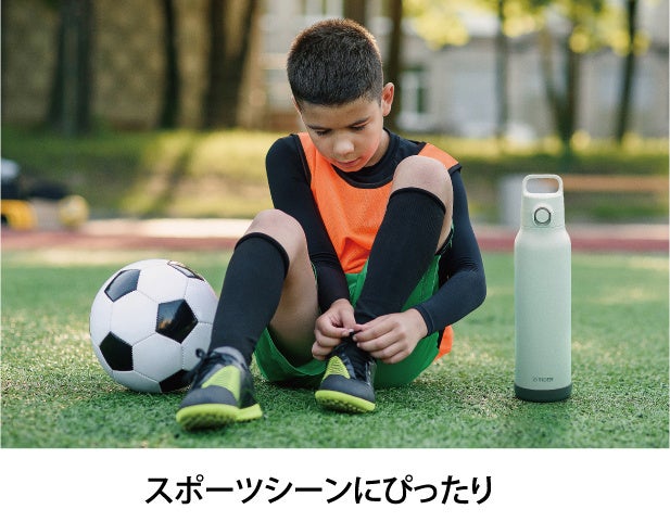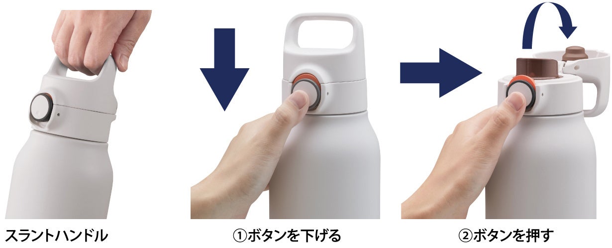 傾斜があり握りやすいスラントハンドルつきで持ち運びがしやすく、ふたはワンプッシュで簡単にオープンするので、片手で操作して、すばやく水分補給することができます。