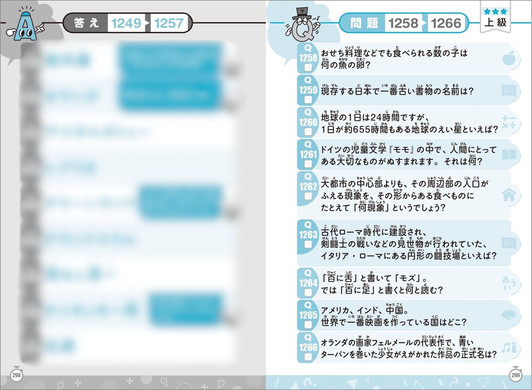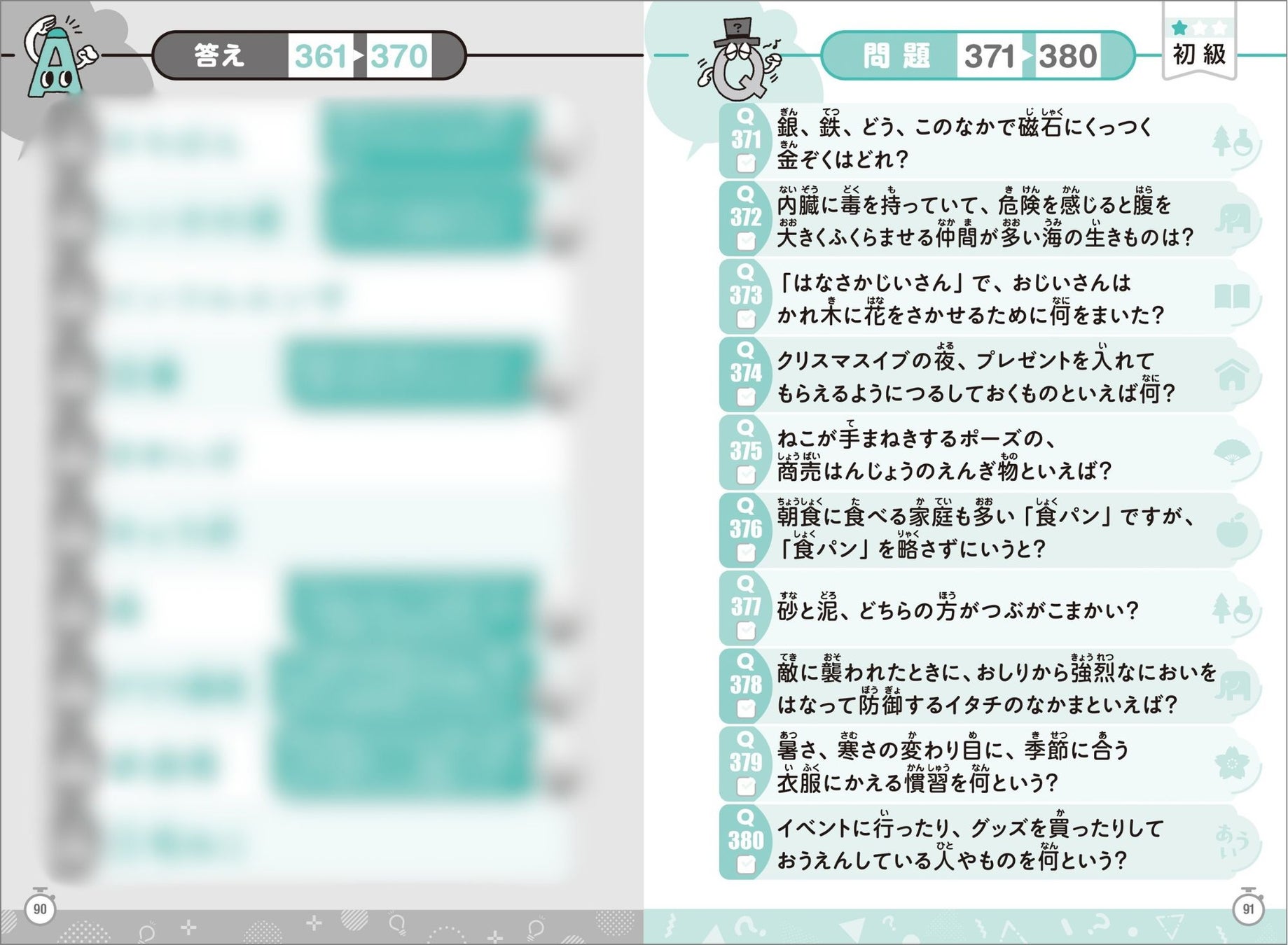 問題数は圧巻の1737問。早押しクイズ用に読み上げて出題できる形式です。「生きもの」「食べもの」「科学」「地理」「文学」「アート」など、ジャンルも多岐にわたり、飽きずに取り組めるボリューム満点の内容です。知識のアウトプットとインプットだけでなく、学年や世代を超えたコミュニケーションにも役立つ1冊。クイズ大会やレクリエーションツールとしても活躍します。