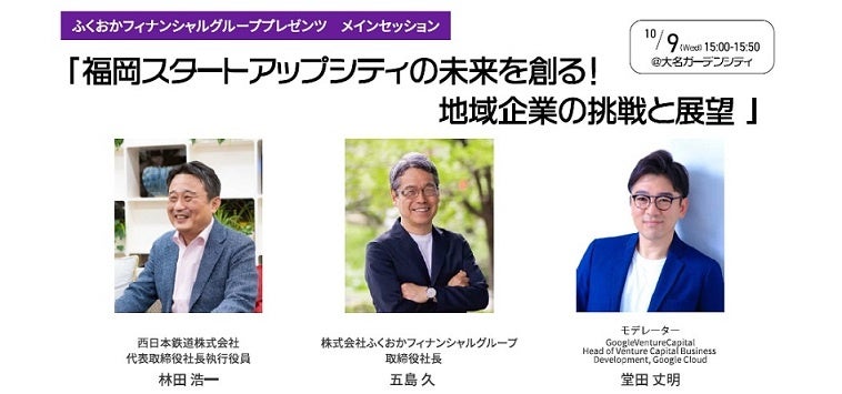 FFGステージでは、「福岡スタートアップシティの未来を創る!地域企業の挑戦と展望 」として 西日本鉄道株式会社代表取締役社長執行役員林田浩一様と、弊社取締役社長五島久とのセッションを実施します。