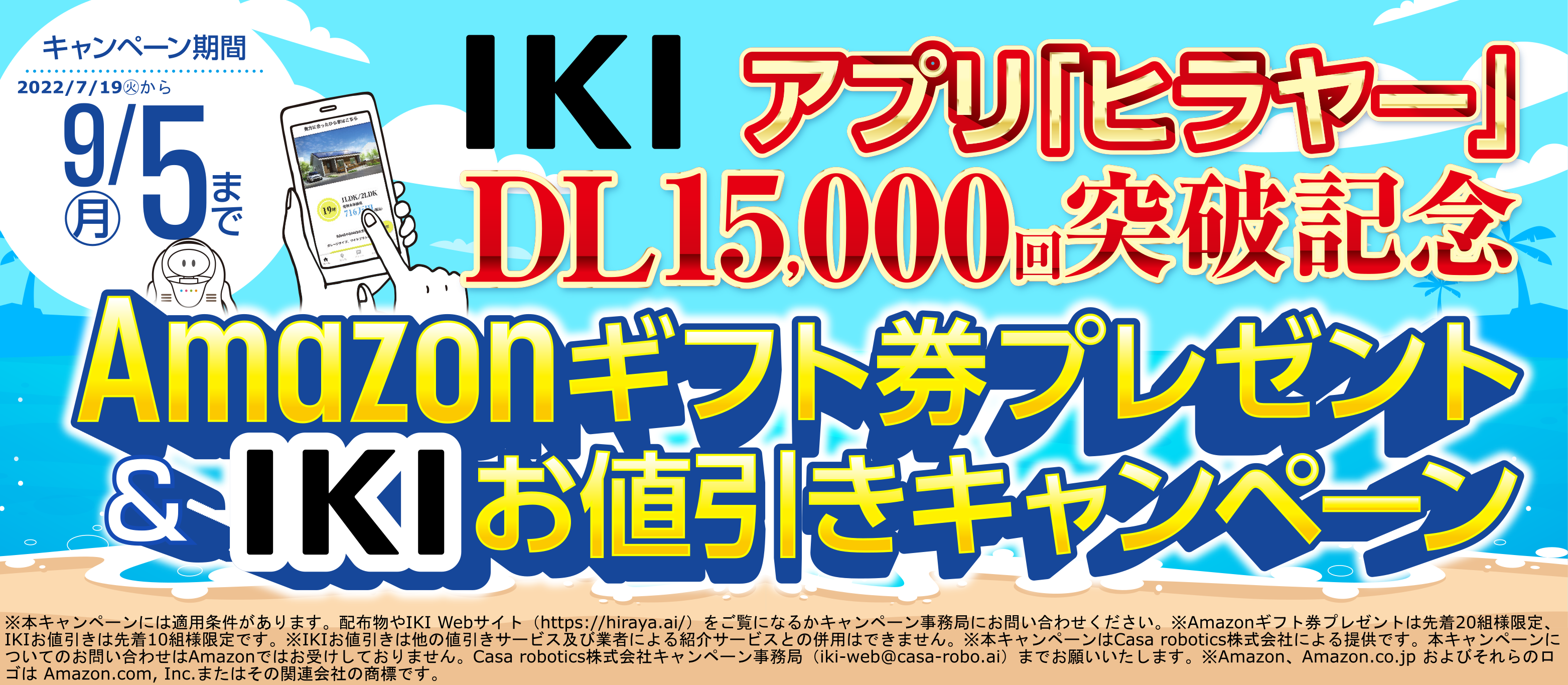 ※お客様の「ヒラヤー」上の会員情報及び利用状況(本キャンペーンにおけるチェックイン状況を含む)をカーザロボティクスが確認した上で、Amazonギフト券当選の場合には、キャンペーン期間終了後に順次「ヒラヤー」に登録されたメールアドレス宛にAmazonギフトコードをお送りいたします。※Amazonギフト券の使用にはAmazonのアカウントが必要となります。※本キャンペーン内でのご本人及び同一世帯の重複当選は無効といたします。※本キャンペーンの主催者はCasa robotics株式会社です。本キャンペーンは主催者によって厳正に運営されます。※カーザロボティクスは、本キャンペーンに関連して生じた応募者の損害について、当社の故意または重大な過失がない限り、一切の責任を負わないものとします。※カーザロボティクスは、本キャンペーンに関連して生じた応募者間または応募者と第三者の間におけるトラブルについて一切の責任を負わないものとします。 ※お客様からご提供いただいた個人情報は、賞品の発送などに利用します。その他の利用目的については個人情報保護方針に記載しておりますので、こちら(https://ki-group.co.jp/policy/)からご覧ください。※本キャンペーンは、予告なく内容の全部または一部を変更する場合がございます。※本キャンペーンはCasa robotics株式会社による提供です。本キャンペーンについてのお問い合わせはAmazonではお受けしておりません。Casa robotics株式会社キャンペーン事務局(iki-web@casa-robo.ai)までお願いいたします。※Amazon、Amazon.co.jp およびそれらのロゴは Amazon.com, Inc.またはその関連会社の商標です。