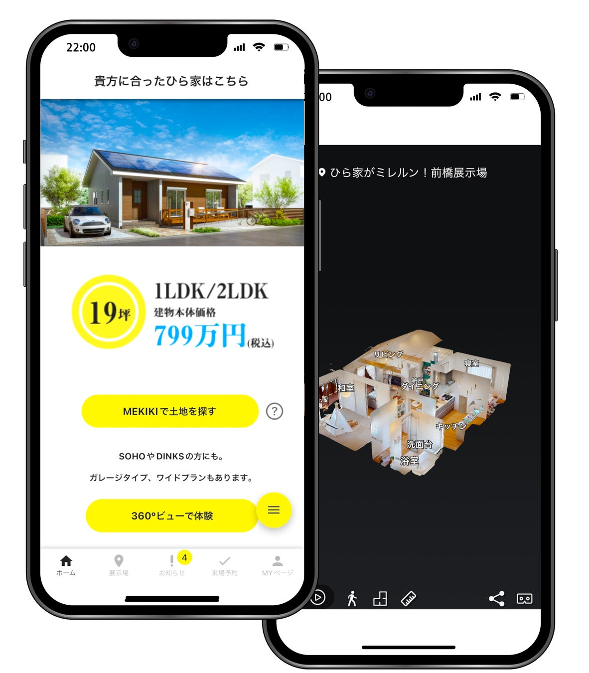IKI専用アプリ「ヒラヤー」はお客様に合った平屋のご提案から、360°ビュー(仮想モデル/VR)での内覧や採寸、土地の検索、チャットでの相談、お引き渡しまでをサポートするアプリです。外出が難しいご高齢の方や、多忙で展示場に足を運べない方でもより手軽に平屋の見学ができます。さらに、アプリに内蔵されたIKIモデルハウスの360°ビューで、本物のモデルハウスを訪れる前でも後でも、どこにいてもバーチャルなモデルハウスの内覧ができます。「ヒラヤー」を使うことで、ご自身が選んだIKIプランへの納得感を深めたり、家族や友人等へIKIモデルハウスを手軽に見せて意見をもらったりすることができます。実際、「ヒラヤー」利用がIKIご契約の最後の一押しになった事例もあります。自分のやり方、自分のペースでIKIの検討を多角的に、繰り返しできるようになることが「ヒラヤー」が支持を集める理由であると考えられます。