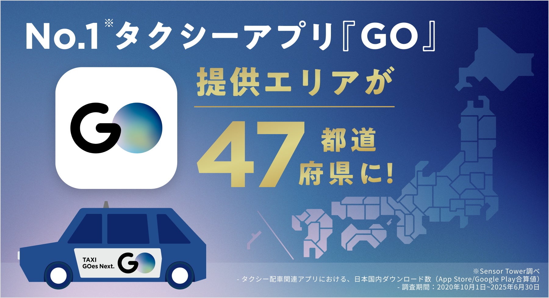 ※1 Sensor Tower調べ - タクシー配車関連アプリにおける、日本国内ダウンロード数(App Store/Google Play合算値) - 調査期間:2020年10月1日~2025年6月30日