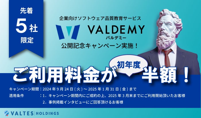 ソフトウェアのテスト・品質向上トータルサポート企業のバルテス・ホールディングス株式会社(本社:大阪市西区、東京都千代田区、代表取締役会長 兼 社長:田中 真史)は、2024年9月24日に公開したソフトウェア学習プラットフォーム「バルデミー」について、公開を記念して先着5社限定で初年度のご利用料金が半額となるキャンペーンを実施しましたことをお知らせいたします。
