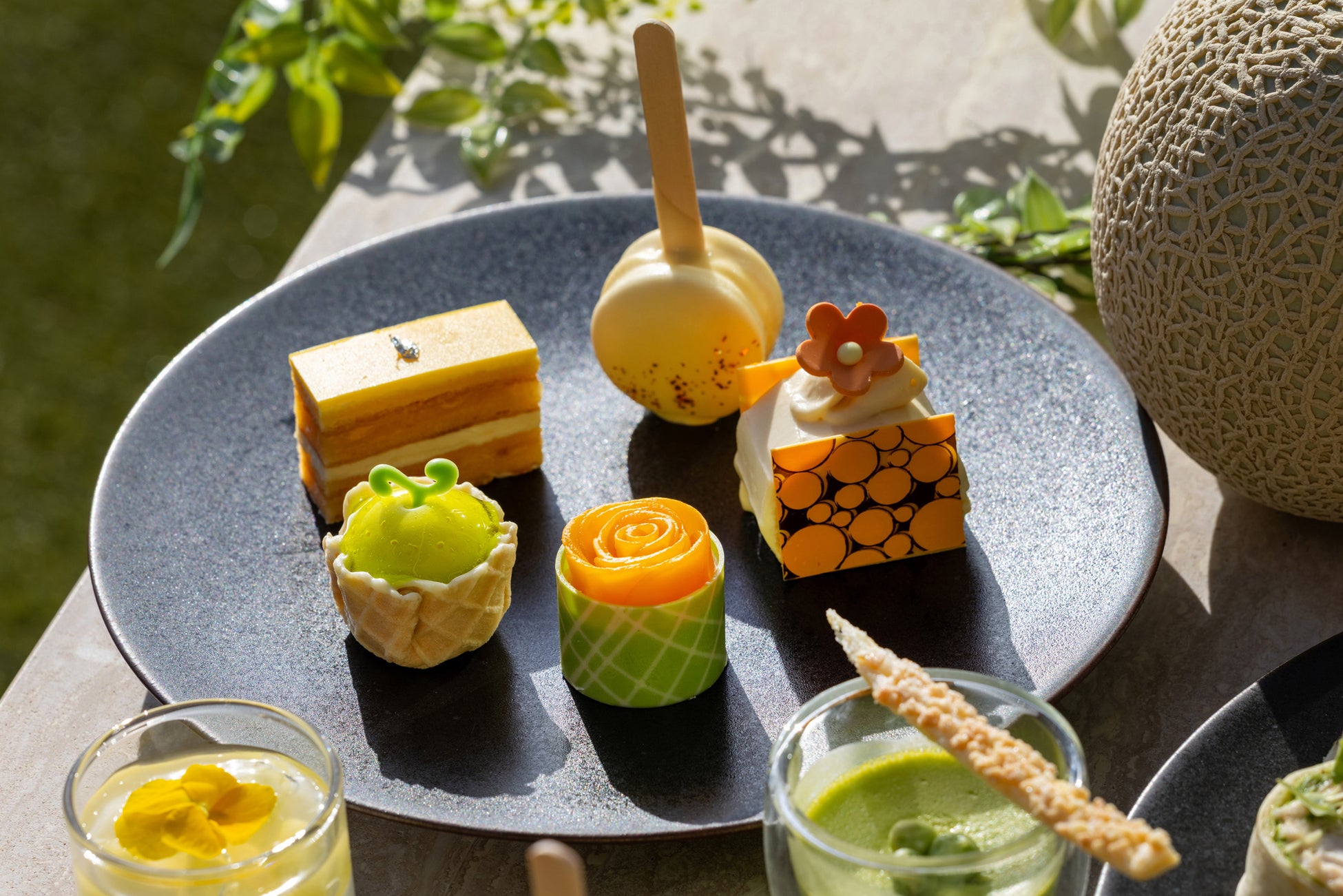 メロンをかたどったメロンチーズムースやオリジナルメロン&マンゴーモクテルマンゴーを花びらのように飾るメロンジュレを閉じ込めたココナッツムースなど「メロン&マンゴー アフタヌーンティー」が新登場