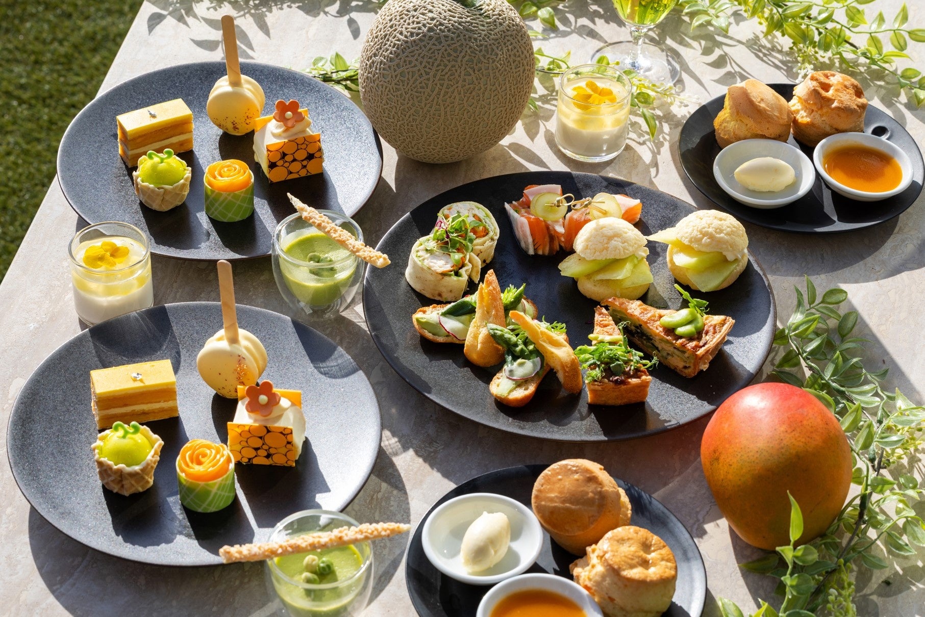 「メロン&マンゴー アフタヌーンティー」では、芳醇な香りが特徴のメロンと濃厚な甘みのマンゴーを存分にお楽しみいただけるメニューをご用意いたします。スイーツは、小さなメロンのような愛らしいシルエットに仕上げるなめらかなメロンチーズムースや、フレッシュマンゴーとマンゴークリームをきめ細かいスポンジで巻き上げるロールケーキ、トップにマンゴーの果肉を花びらのように飾るメロンジュレを閉じ込めたココナッツムースなどが登場。さらに、マンゴーとパッションフルーツのアイスクリームをマカロンでサンドするロリポップや、フレッシュメロン入りのハニーゼリーとブランマンジェとあわせる爽やかなグラススイーツなど、暑い日にも涼を感じるひんやりスイーツもご提供いたします。セイボリーでは、夏野菜をたっぷりと盛り付けるエクレアや、グリーンピースに卵や生クリームを加えクリーミーに仕上げる冷製のフランなど、フレンチのシェフならではのメニューに加え、メロンパンで生ハムメロンとチーズをはさむサンドイッチなど遊び心のあるアイテムも並びます。さらに、マンゴーアイスティーをベースにしたメロンの風味もお楽しみいただけるオリジナルモクテル(ノンアルコールカクテル)をウェルカムドリンクとしてご用意するほか、マンゴーフレーバーティー、紅茶、コーヒーなどをフリーフローでご提供いたします。