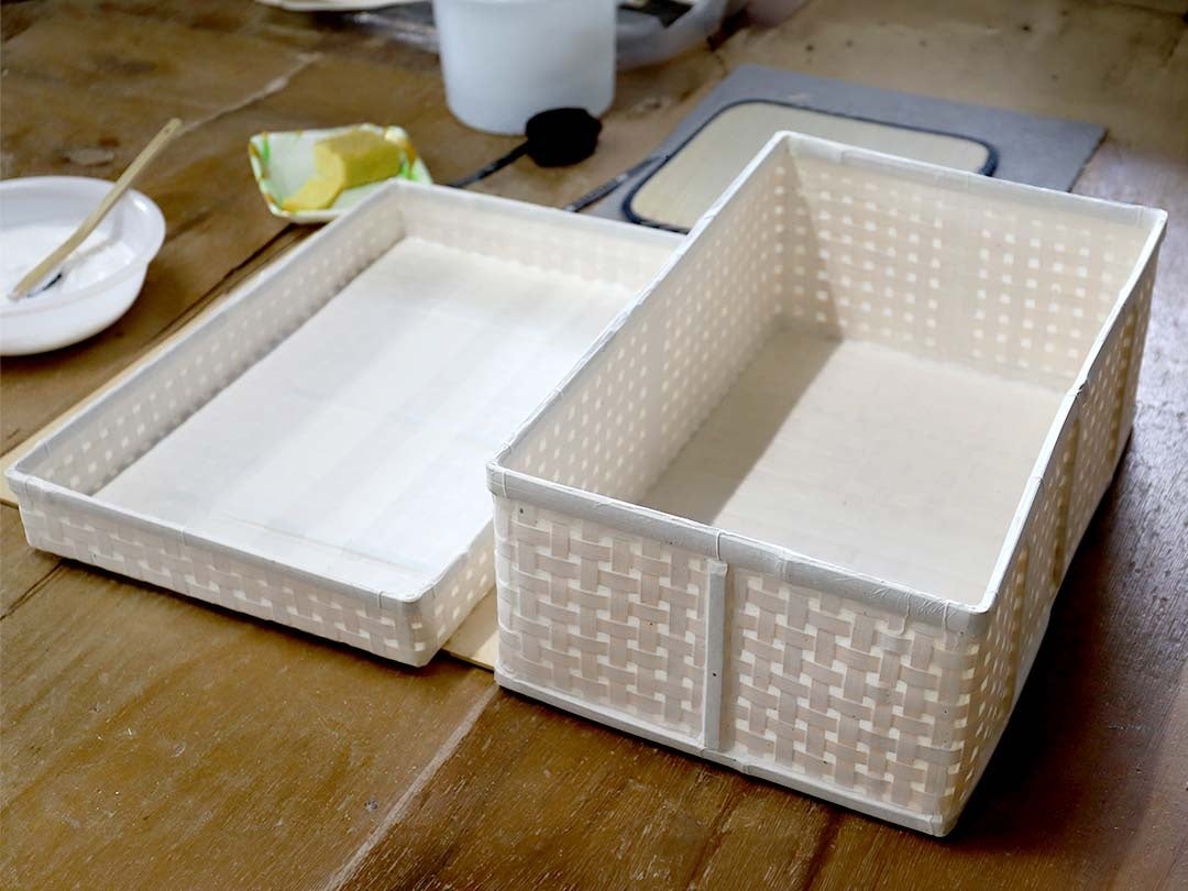 一閑張りとは、竹で編んだ籠の表面に和紙を幾重にも貼り重ね、仕上げに柿渋などを塗布して完成させる伝統技法です。しっかりと編み上げられた竹の下地に、和紙と柿渋が加わることで、軽さと丈夫さを兼ね備えた収納箱が生まれます。