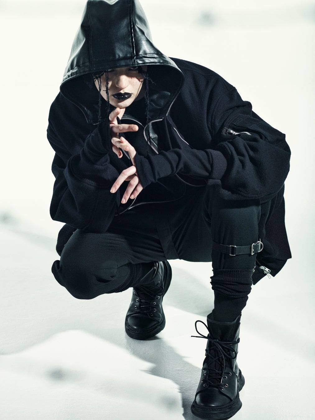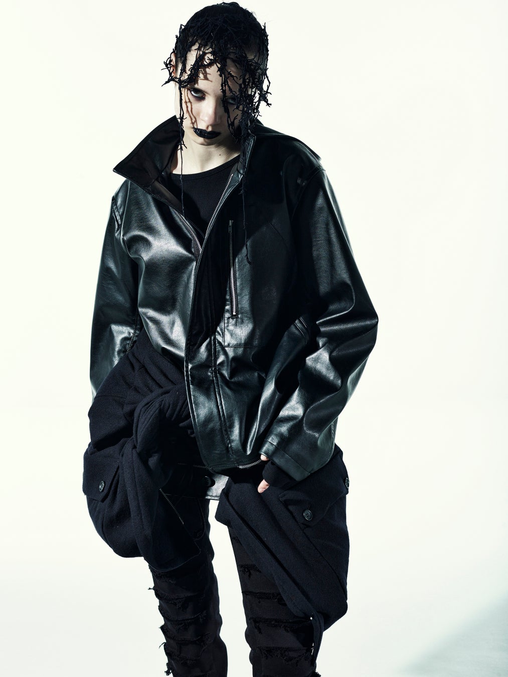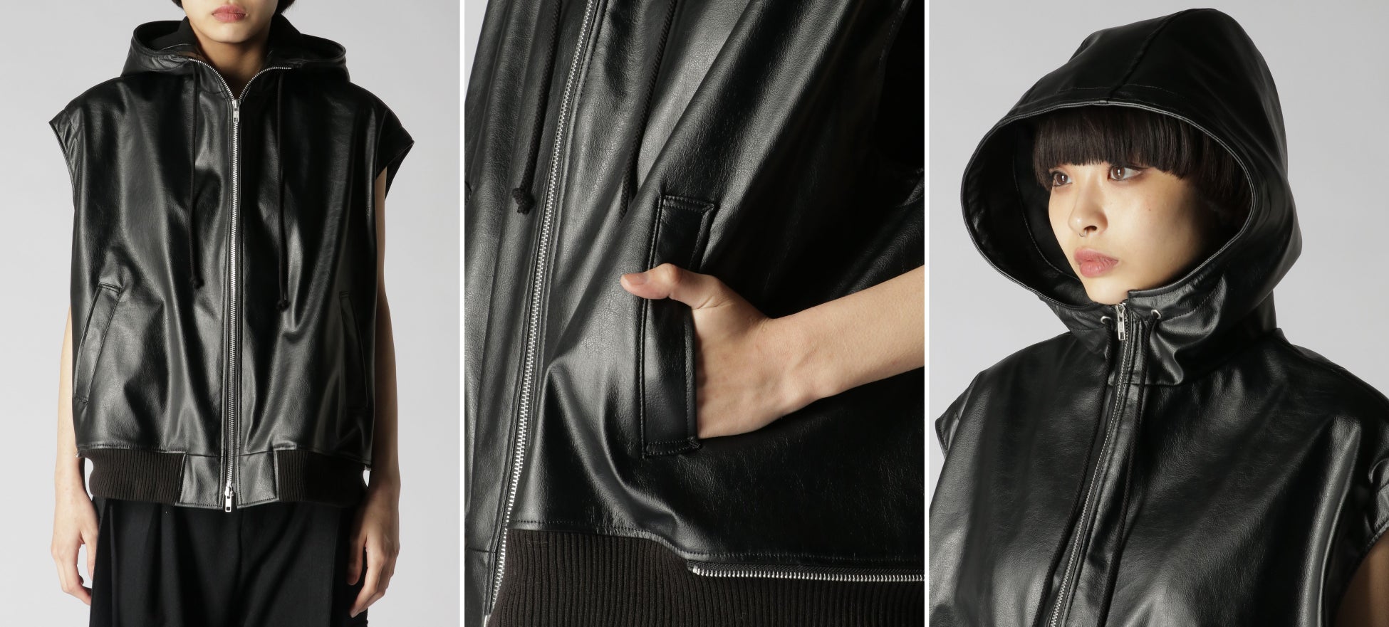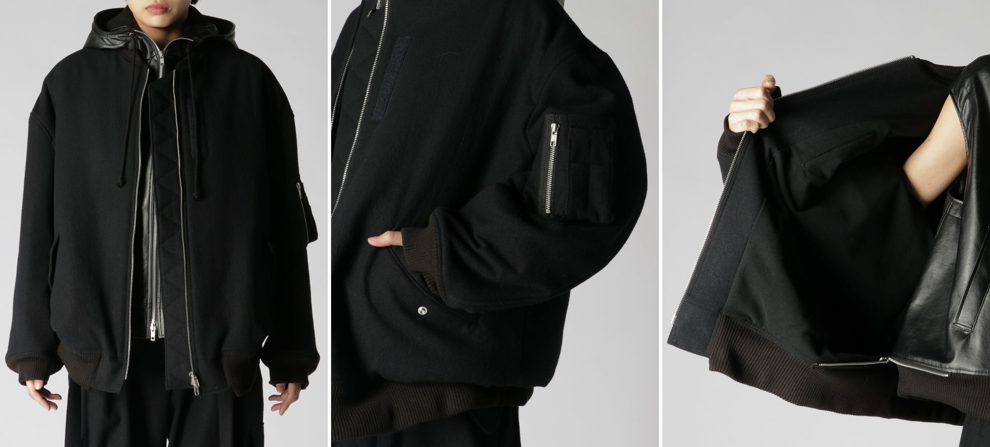 ブルゾンとフェイクレザーのフーディーがレイヤードされたオーバーサイズのダブルブルゾン。ブルゾンは、強度の縮絨を生地にかけることで生み出されるきめの細かい凹凸によって、高い保温性を備えるウールギャバジンを使用。ノースリーブのフーディーは、本革のような光沢やシボ、質感に限りなく近づけており、内側の裾にあるジッパーでブルゾンとの合体と分離が可能。ブルゾンの左袖にはユーティリティポケットを装備し、フーディーは首元を外気から守る防寒と防風に優れた仕様となります。