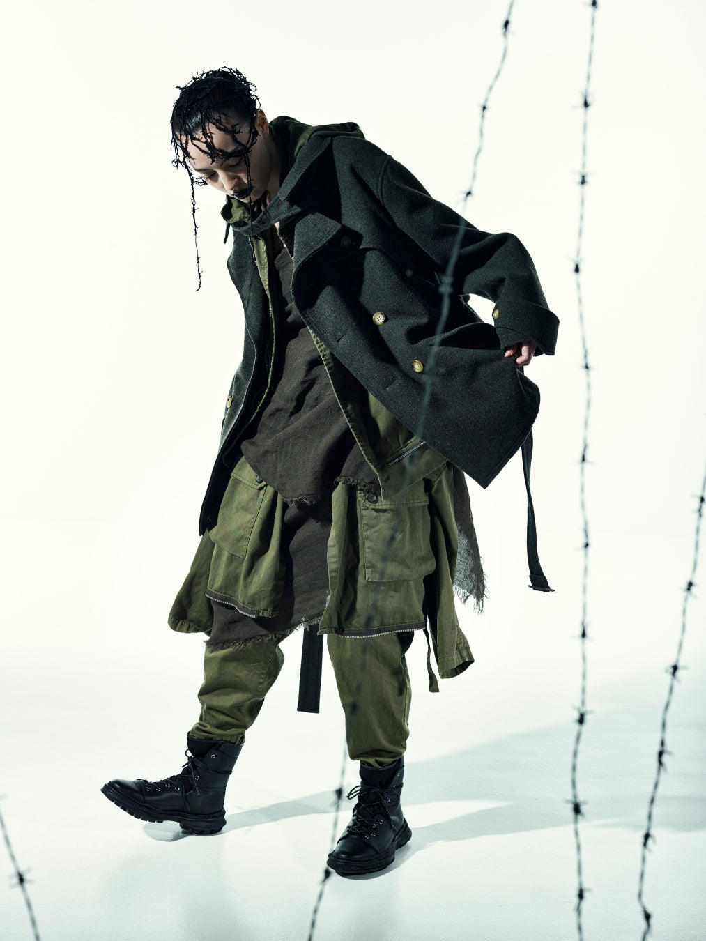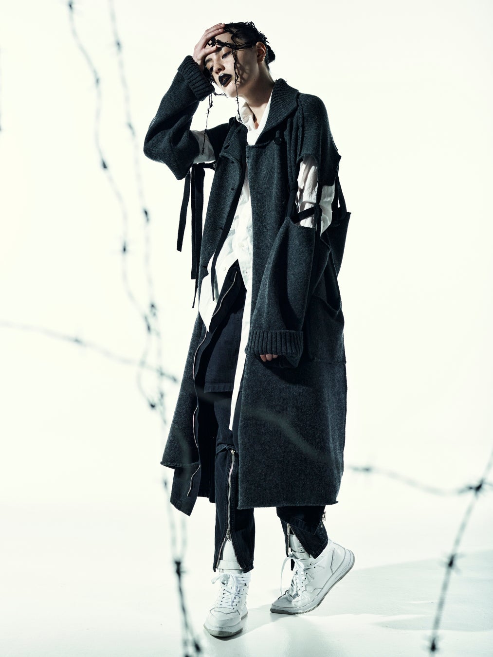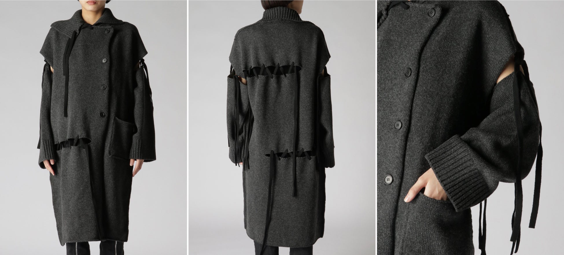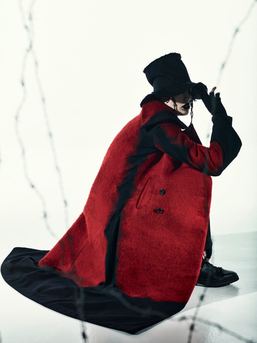 赤が黒に変化していくのか、もしくは黒が赤に変化しようとしているのか。2つの色が1枚のコートの上で溶け合うさまを、黒のモッサ生地の上に手で赤綿をちぎりながら並べた後、ニードルパンチ加工を施すことで表現。フェルトのようになめらかで織り目の見えにくいモッサの特性は、この幻想的な世界観をより的確に表すことを可能にしています。大胆なアシンメトリーの衿元や袖口のスリットを配しつつも、ストレートカットのダブルブレストといった品のあるクラシカルなロングコートに仕上げています。