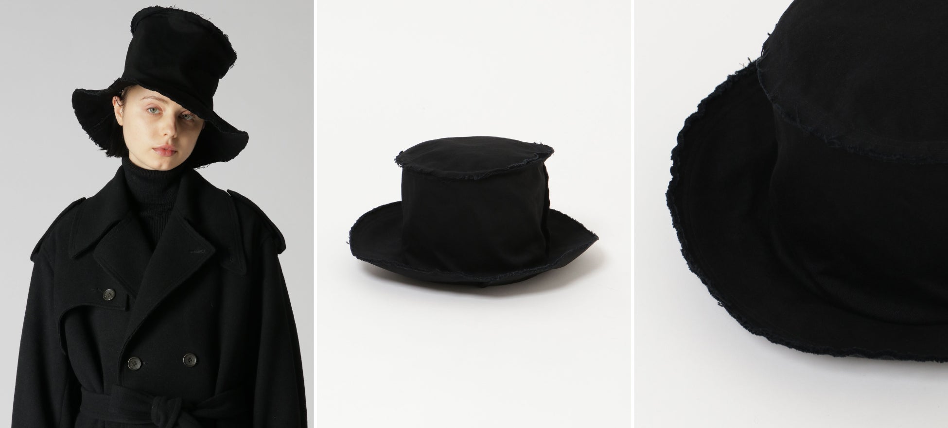 ブラックデニム製のシルクハット。完成した製品に洗いをかけることで、断ち切り仕様のデザインに風合いを出しており、正装感のあるシルクハットにデイリーさを加えています。