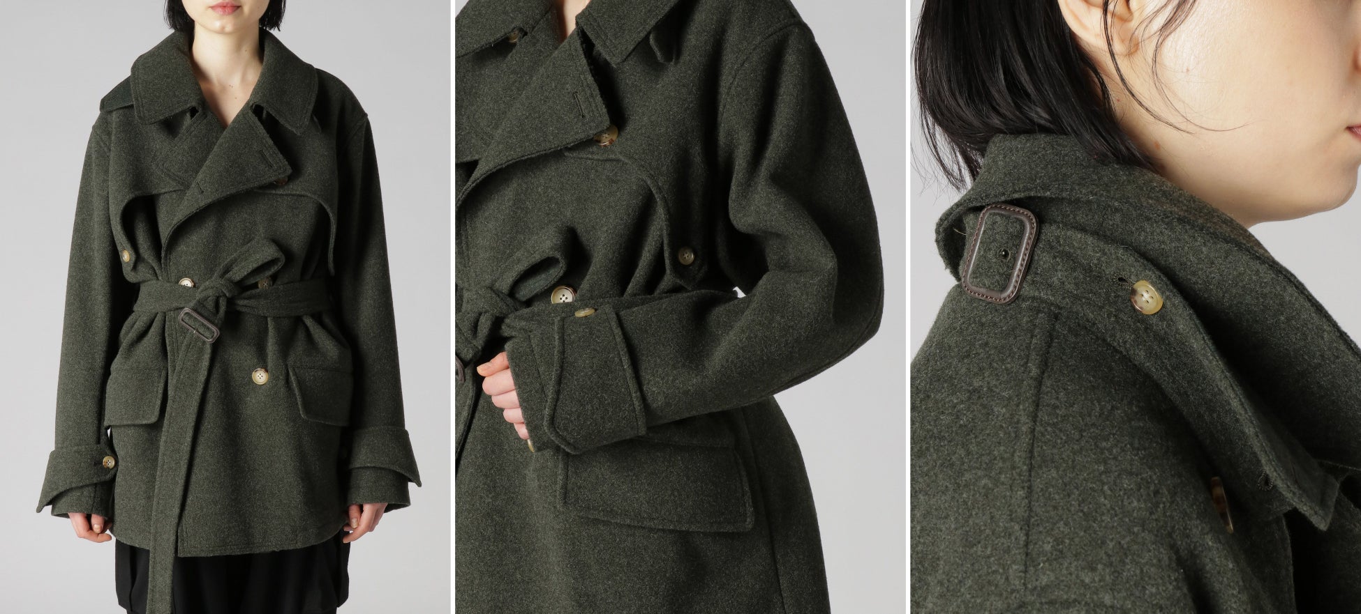 身体に沿う優しいラインのガンフラップと丸みを持たせたボリュームのある特徴的なスリーブは、メンズライクなミリタリーアイテムに女性らしさと洗練さを加えています。縮絨加工によって生地密度を高めた保温性に優れたウール生地は、しっかりとした感触がありながらも身体に負担のない軽さが特徴。上品なモスグリーンカラーはこれから肌寒くなる季節のコーディネートにぴったり。