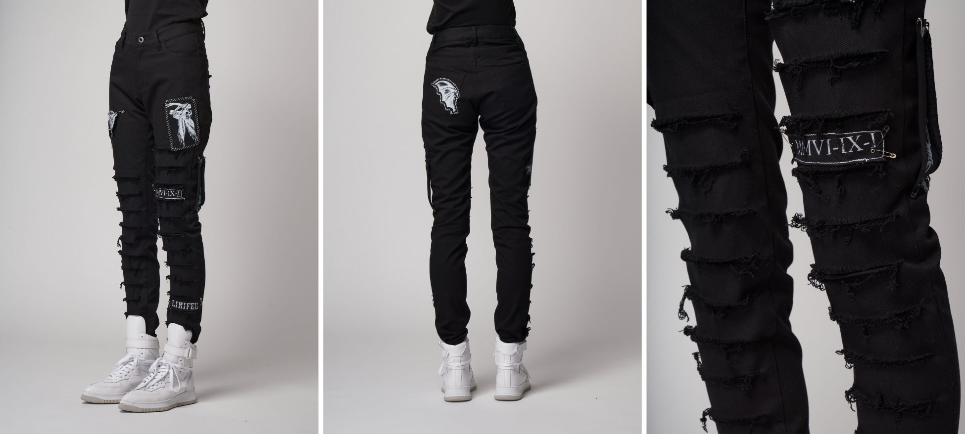 大胆なスラッシュが入ったスキニーパンツ。取り外し可能な数種類のオールドタトゥー・ワッペンは、パンキッシュな装いのなかにもハンドメイド的な温もりを持ち合わせており、自分好みのスタリングでコラージュすることが可能です。伸縮性のあるデニムライクなコットン生地を使用。