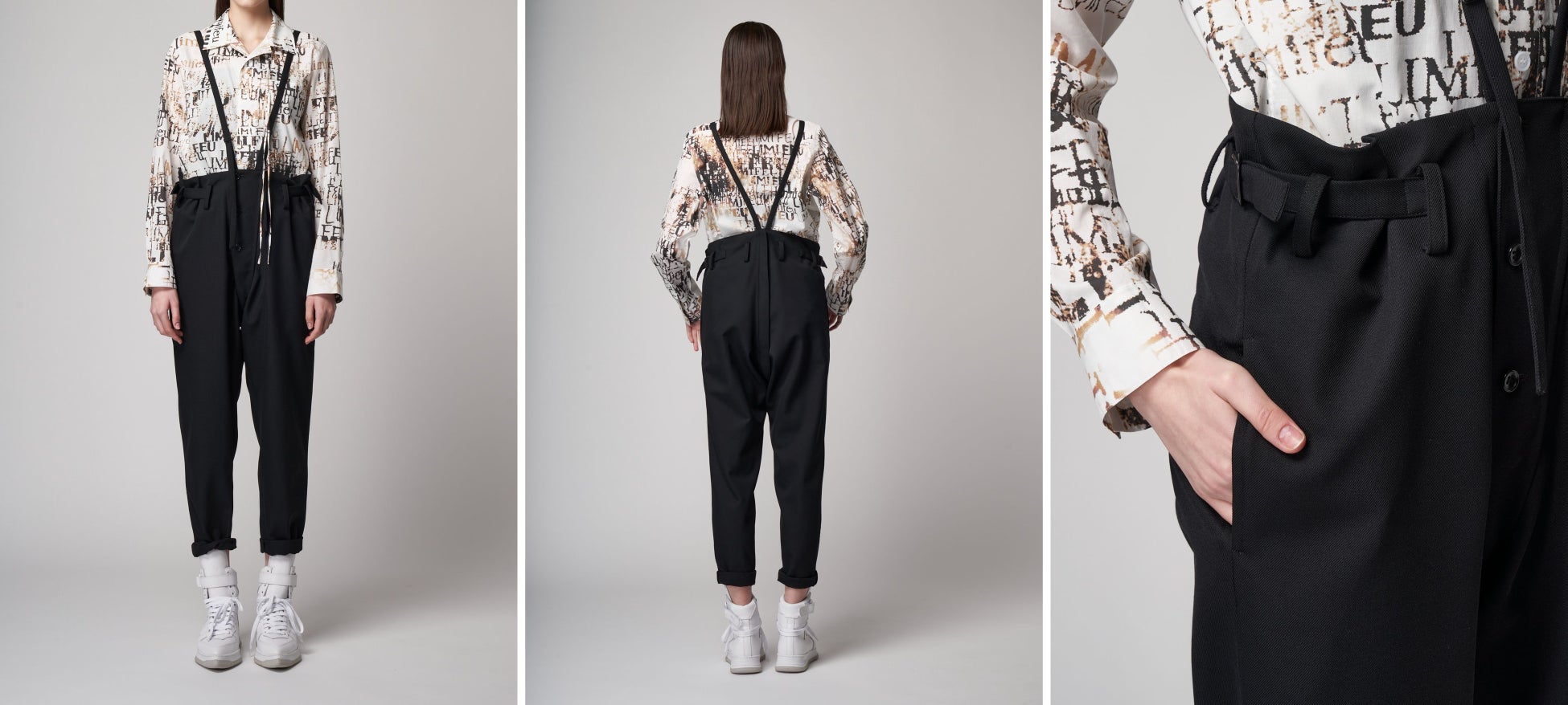 Vラインのサスペンダーパンツ。ヴィンテージミリタリーを彷彿とさせる高密度で美しいサージを使用。前身頃の中心を起点に描かれるVラインは、アクセサリー的なスタイリングポイントとしても有効です。両脇のベルト調節により、ハイウエストパンツのシルエットに変化させることが可能です。