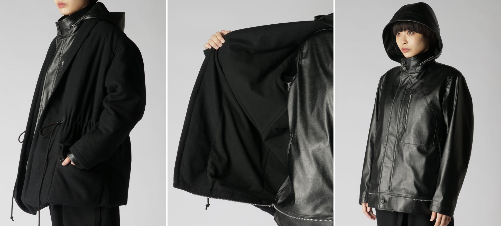 ハーフコートとフーディーによる2着分のビックシルエットが特徴的なダブルコート。ハーフコートは、強度な縮絨により軽さと柔らかい肌触りを実現したウールギャバジンを使用。フーディーは、本革のような光沢やシボ、質感を限りなく再現したフェイクレザーを使用。内側の裾に装着されたジッパーでハーフコートとの合体と分離が可能。フーディーは首元を外気から守る防寒と防風に優れた仕様となり、衿元のポケットにフードを収納することが可能です。