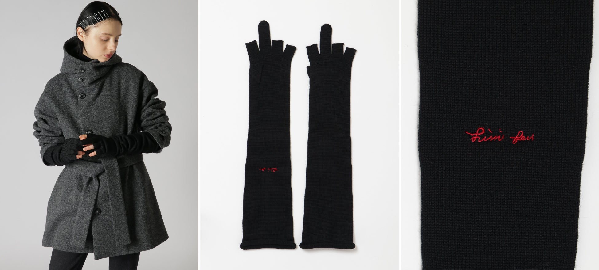 肌触りの良いホールガーメントの編地仕立てのロンググローブ。左手袋の内側にはデザイナー自身が書きおこしたロゴを刺繍しています。カットオフされた指先でスマートフォンやタブレットの操作が可能となり、ストレスフリーかつパンキッシュなデザインとなります。