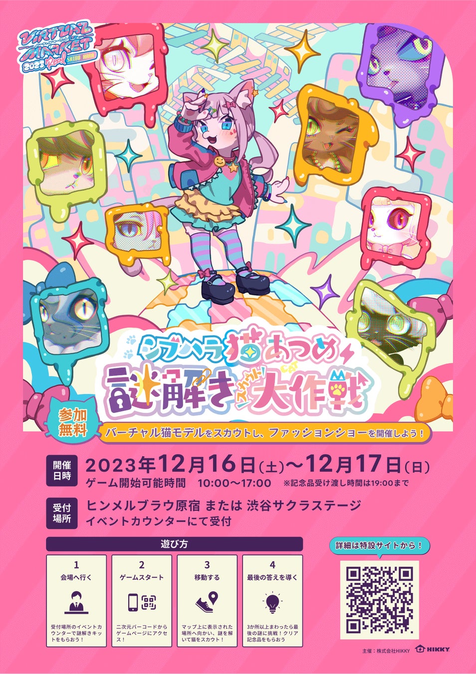 バーチャルファッションデザイナーを目指す猫の少女「まーにゃ」とともに、最大10か所ある会場や店舗を巡って謎を解きながら、"バーチャル猫モデル”を集めましょう!