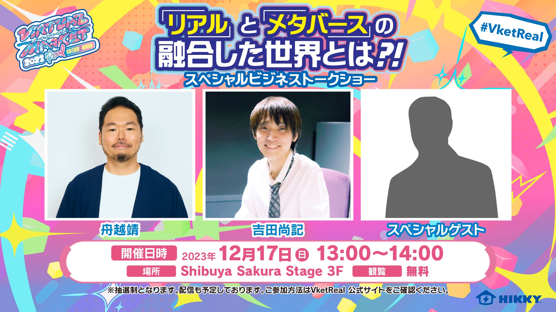 バーチャルMC・一翔剣としても活動するニッポン放送アナウンサー・吉田尚記氏とスペシャルゲストを迎えて、『リアルとメタバースの融合』をテーマにビジネストークショーを開催!夏のVketReal inアキバの成功を受けて挑む今回のVketReal inシブハラを、ビジネス視点で解説します。今だからこそ話したい、リアルとメタバースが“融合”した世界について語り合う1時間です。