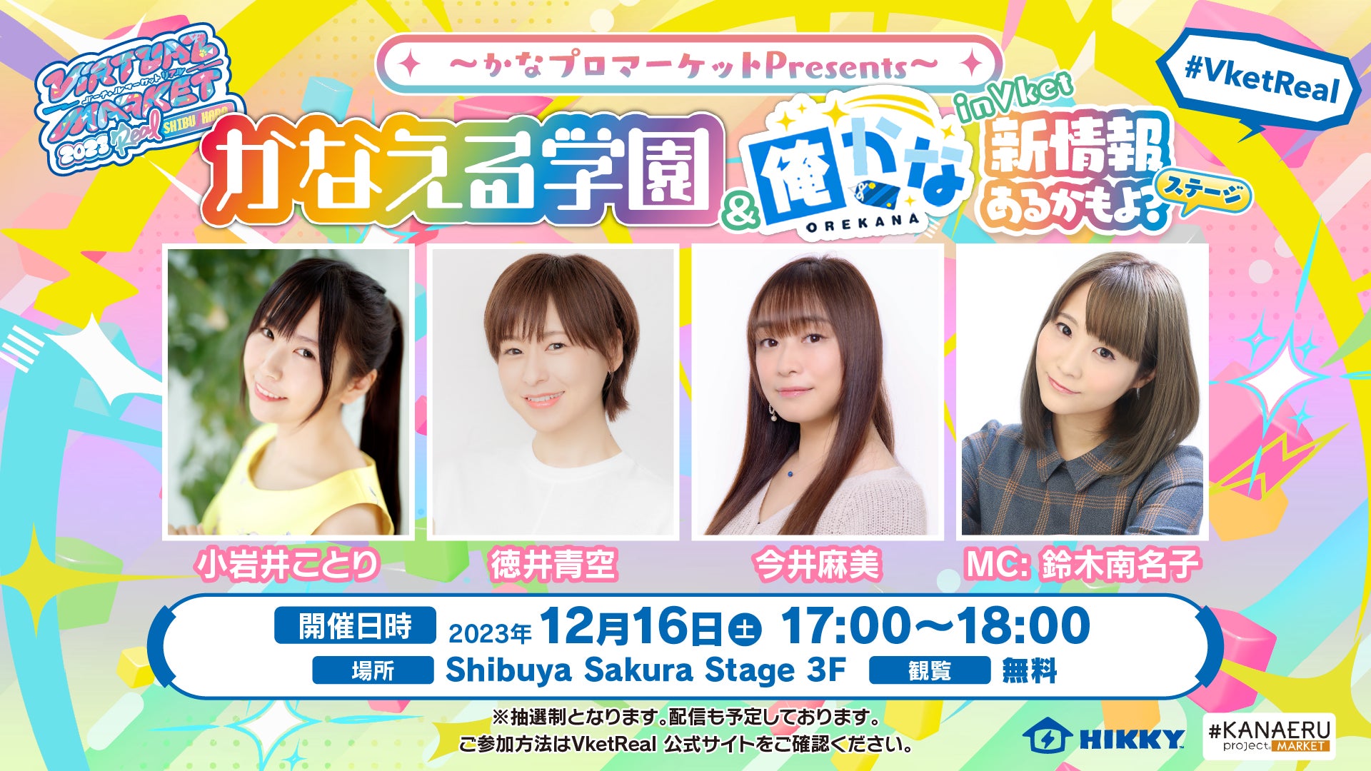 かなプロマーケット発祥の「かなえる学園」&「俺かな」のコラボステージがバーチャルマーケットリアルに登場!かなえる学園や俺かなでお馴染みの声優「小岩井ことり」「徳井青空」「鈴木南名子」、更に「今井麻美」を新たにお迎えして、この時期ならではのサンタコスチュームに身を包みステージを彩ります!