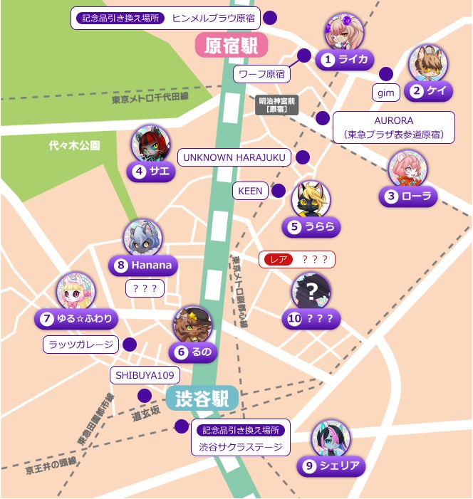 会場 | ①ヒンメルブラウ原宿(東京都渋谷区神宮前1丁目19-19) ②ワーフ原宿(東京都渋谷区神宮前1丁目9−1) ③UNKNOWN HARAJUKU(東京都渋谷区神宮前6丁目5−番10 号) ④SHIBUYA109渋谷店 店頭イベントスペース(東京都渋谷区道玄坂2丁目29−1) ⑤Shibuya Sakura Stage(東京都渋谷区桜丘町1番1号) 他、渋谷・原宿の駅や街の店舗でもコラボコンテンツを実施予定 |