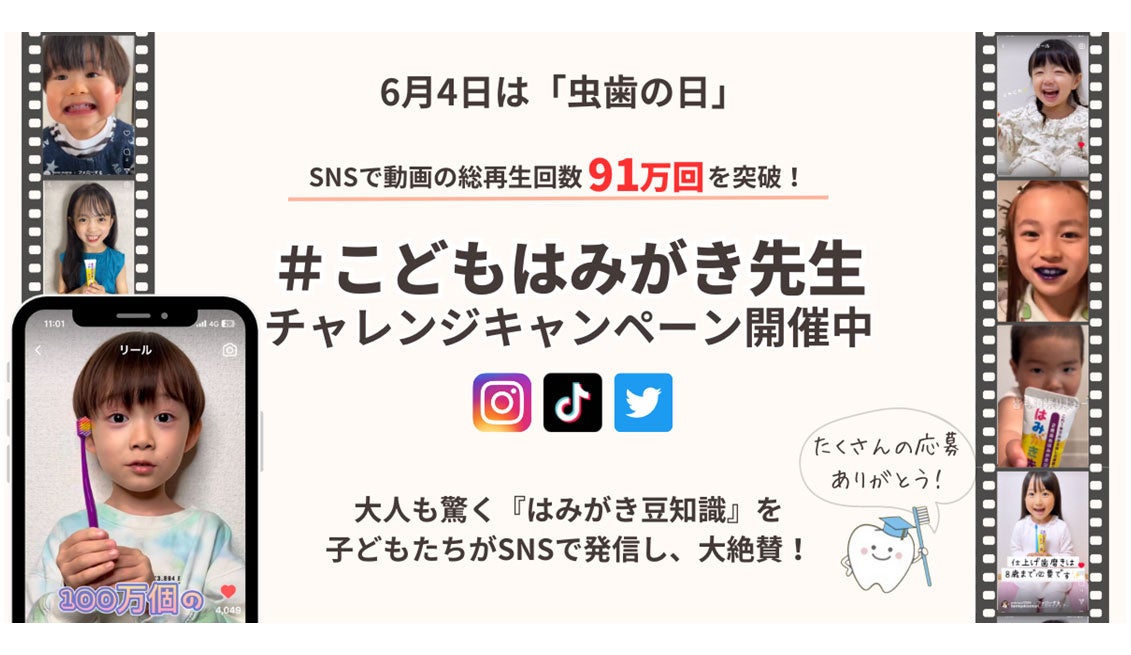 本キャンペーンを通じて、6月4日「虫歯の日」にSNS上にたくさんの「こどもはみがき先生」が投稿され、投稿を見た多くの人が正しい歯磨きの知識を学ぶきっかけとなることを願っています。