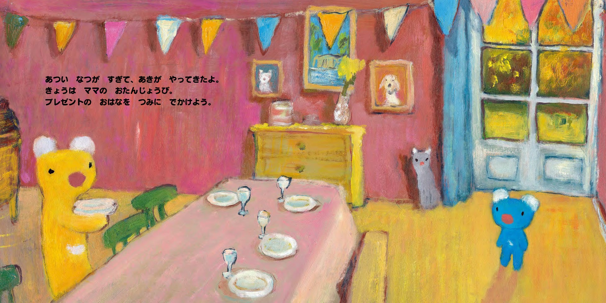 あついなつがすぎて、あきがやってきたよ。きょうはママのたんじょうび。プレゼントのおはなをつみに、あきののはらに、でかけよう!