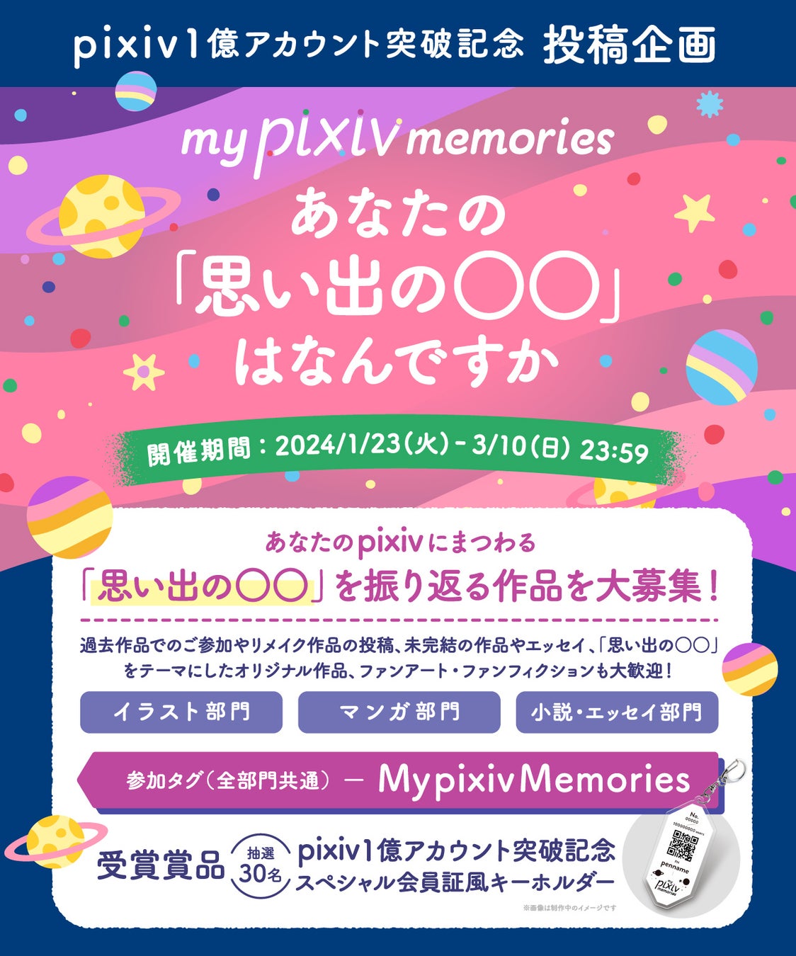 1億アカウント突破を記念し、あなたの「思い出の○○」を振り返る作品を募集します。大事な作品や好きなキャラクターとの出会い、pixiv登録のきっかけ、「推し」や「沼」、思い入れのあるオリジナル作品、創作活動や仲間とのエピソードなど、pixivでの思い出にまつわる作品であればなんでもOKです。