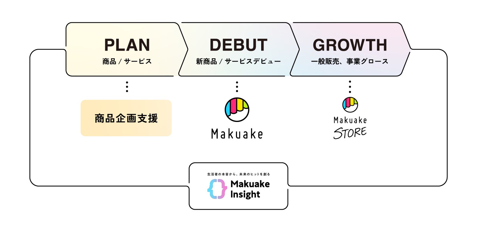 マクアケでは現在、新商品・サービスのデビューのプラットフォームである「Makuake」(DEBUT)サービスに加えて、「Makuake」前の商品企画支援等のPLANフェーズの支援、「Makuake」後の一般販売・事業成長支援のGROWTHフェーズの支援としてEC販売・プロモーション・物流をマクアケが代行し、販路拡大を支援する「Makuake STORE for ECモール」、そして生活者の声とデータを活用した事業者向けリサーチサービス「Makuakeインサイト」サービス等を展開しています。