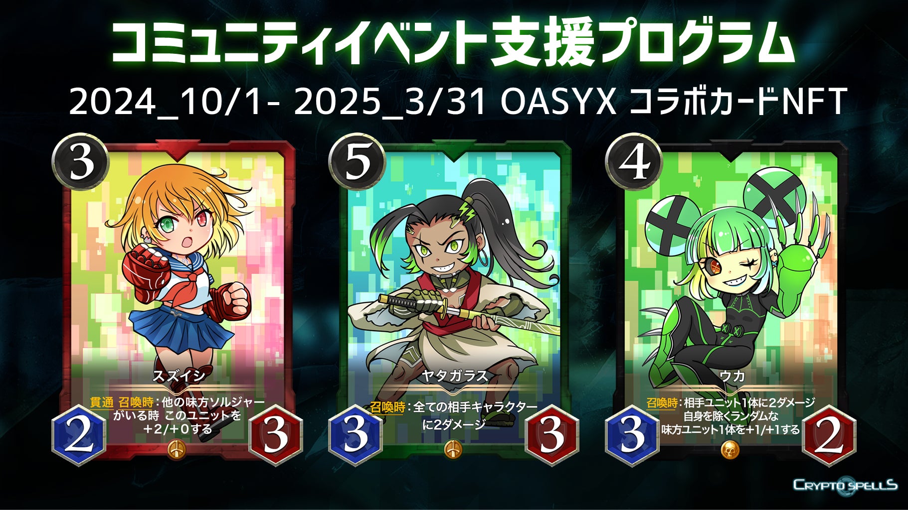 CryptoGamesが運営するブロックチェーンゲーム「クリプトスペルズ」にて2024年10月から2025年3月までのコミュニティイベント支援プログラム報酬として、OASYXコラボカード3種を発表いたします。OASYX Series1のキャラクターであるスズイシ、ヤタガラス、ウカの3名がカードとして登場します。