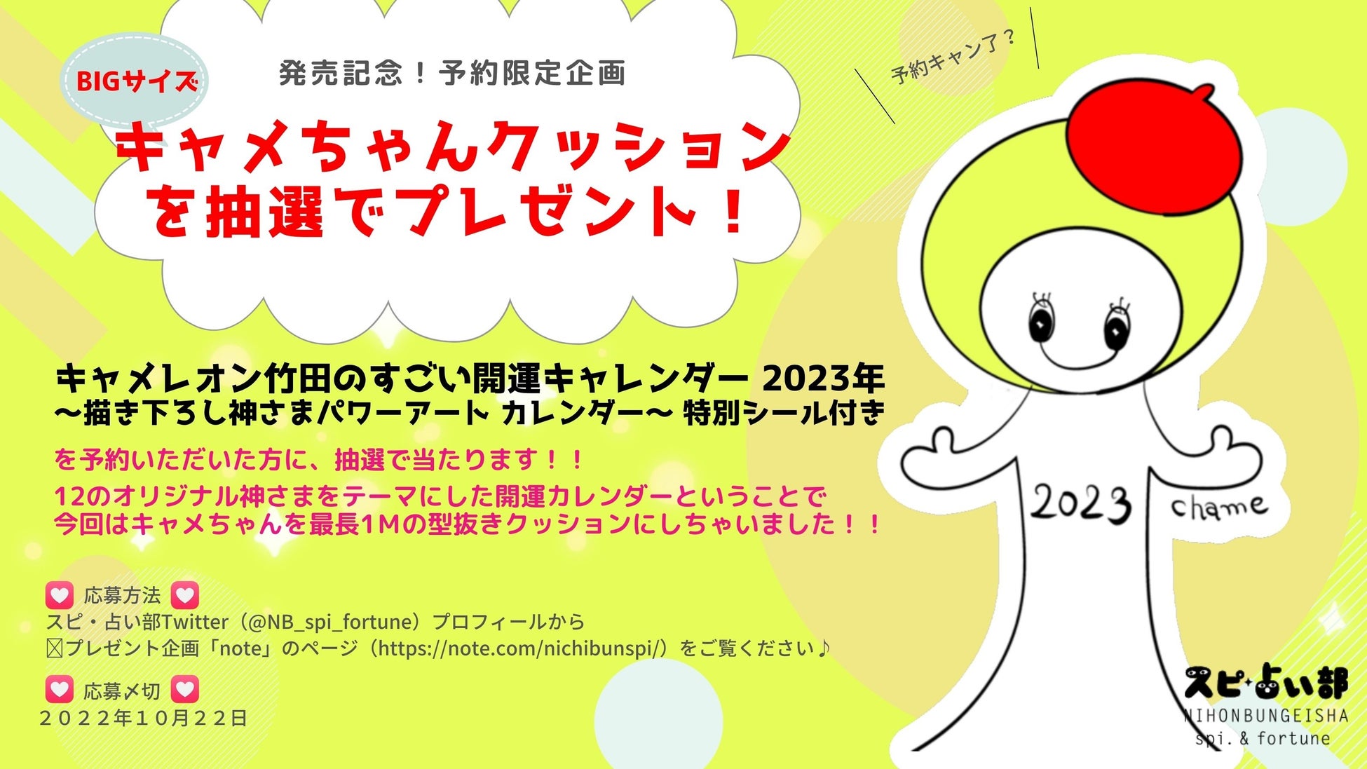 著者初の大判カレンダー『キャメレオン竹田のすごい開運キャレンダー 2023年 ~描き下ろし神さまパワーアートカレンダー~ 特別シール付き』限定発売!キャメちゃんクッションが当たるキャンペーンも実施中!