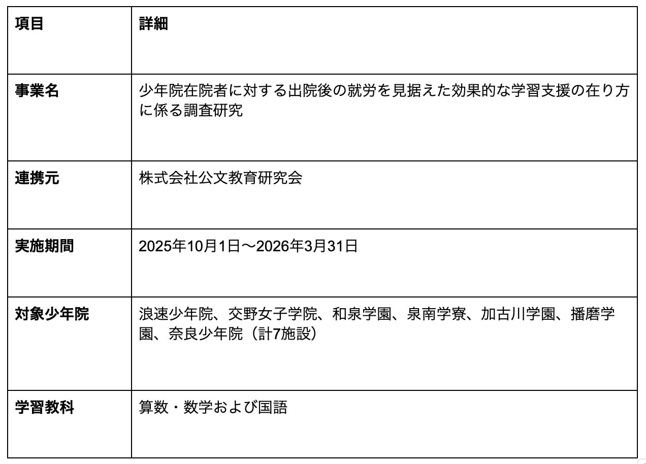 株式会社キズキ(本社:東京都新宿区、代表取締役:安田祐輔)は、不登校・中退者等の支援や、かねてから実施している少年院での高卒認定取得に向けた支援で培ってきたノウハウを活かし、法務省からの調査研究事業を受託した株式会社公文教育研究会(本社:大阪府大阪市、代表取締役:田中三教)と連携し、2025年10月1日から、近畿地方にある7つの少年院(浪速少年院、交野女子学院、和泉学園、泉南学寮、加古川学園、播磨学園、奈良少年院)において、在院者向けの「就労を見据えた効果的な学習支援プログラム」の提供を開始しました。