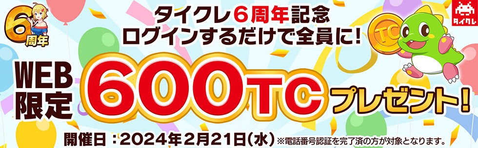 8.2/21は「タイクレの日」WEB限定!ログインするだけで「600TC」プレゼント! 2024/2/21(水)
