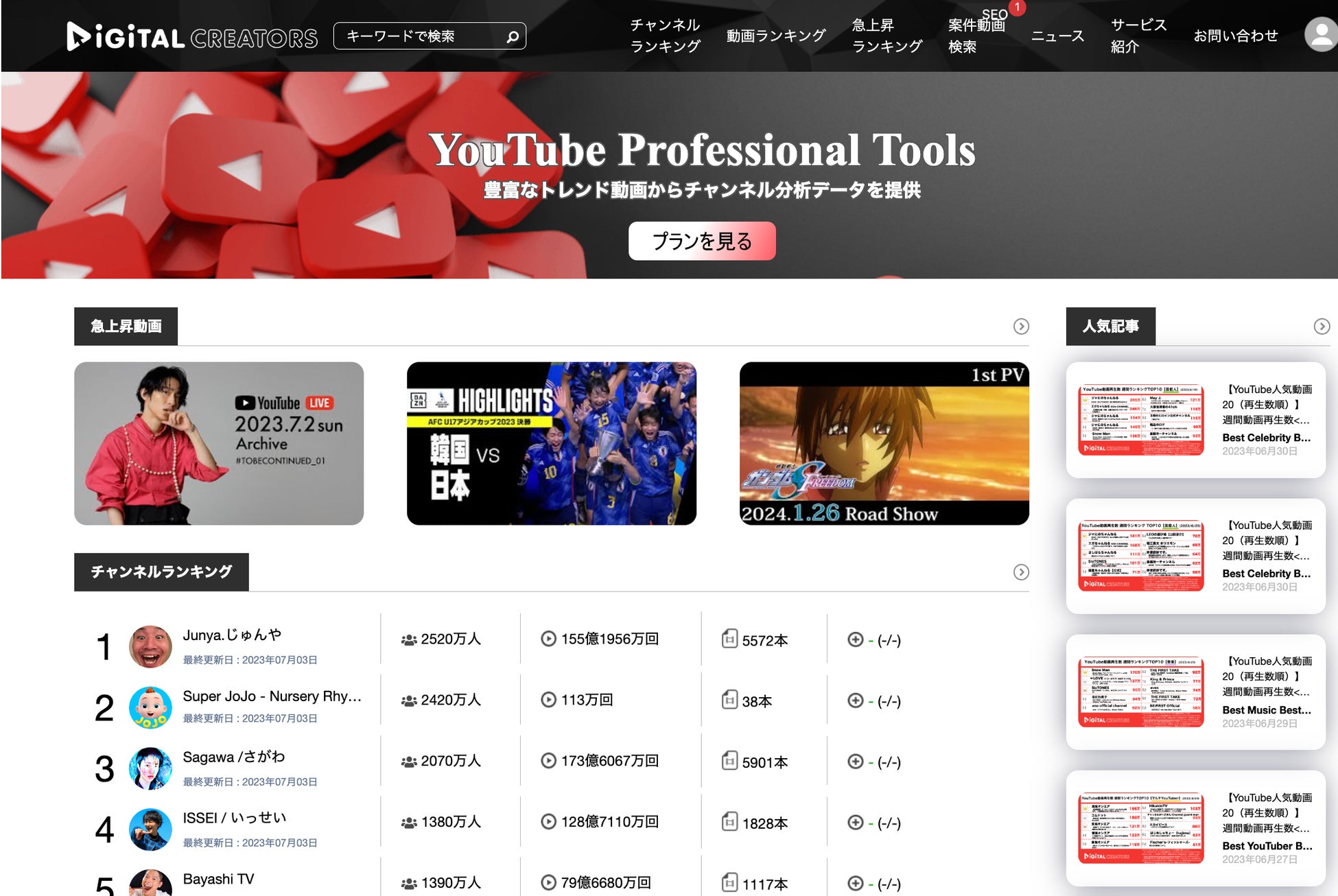 Digital Creatorsは、YouTubeの人気チャンネルや動画などのランキングデーターを無料でチェックできるサイトです。YouTube動画再生数ランキングは、週間ランキングや月間ランキングや年間ランキングなど期間別のランキングのほかに、ジャンル別ランキングなど、様々なデーターを公開していく予定です。