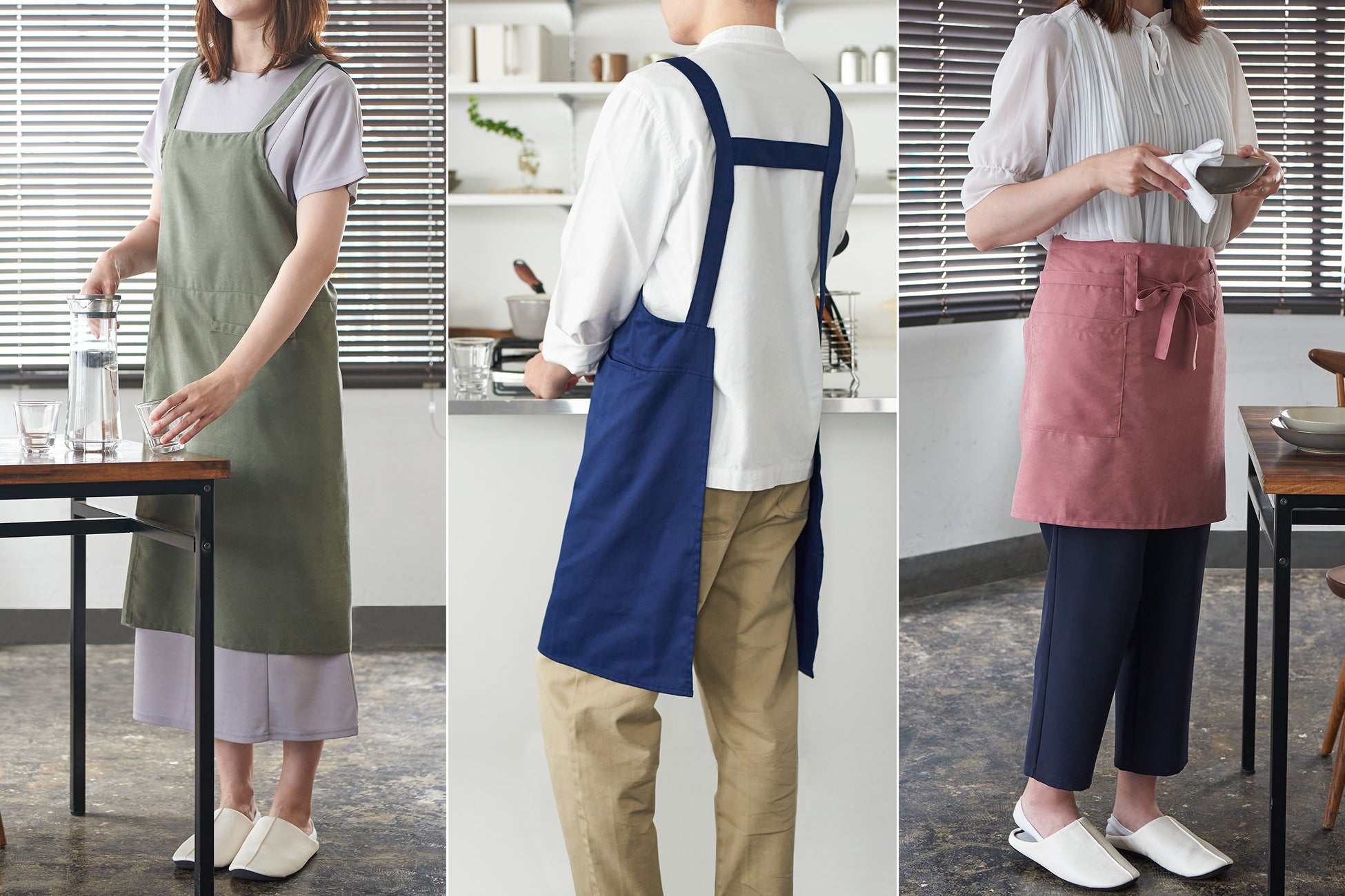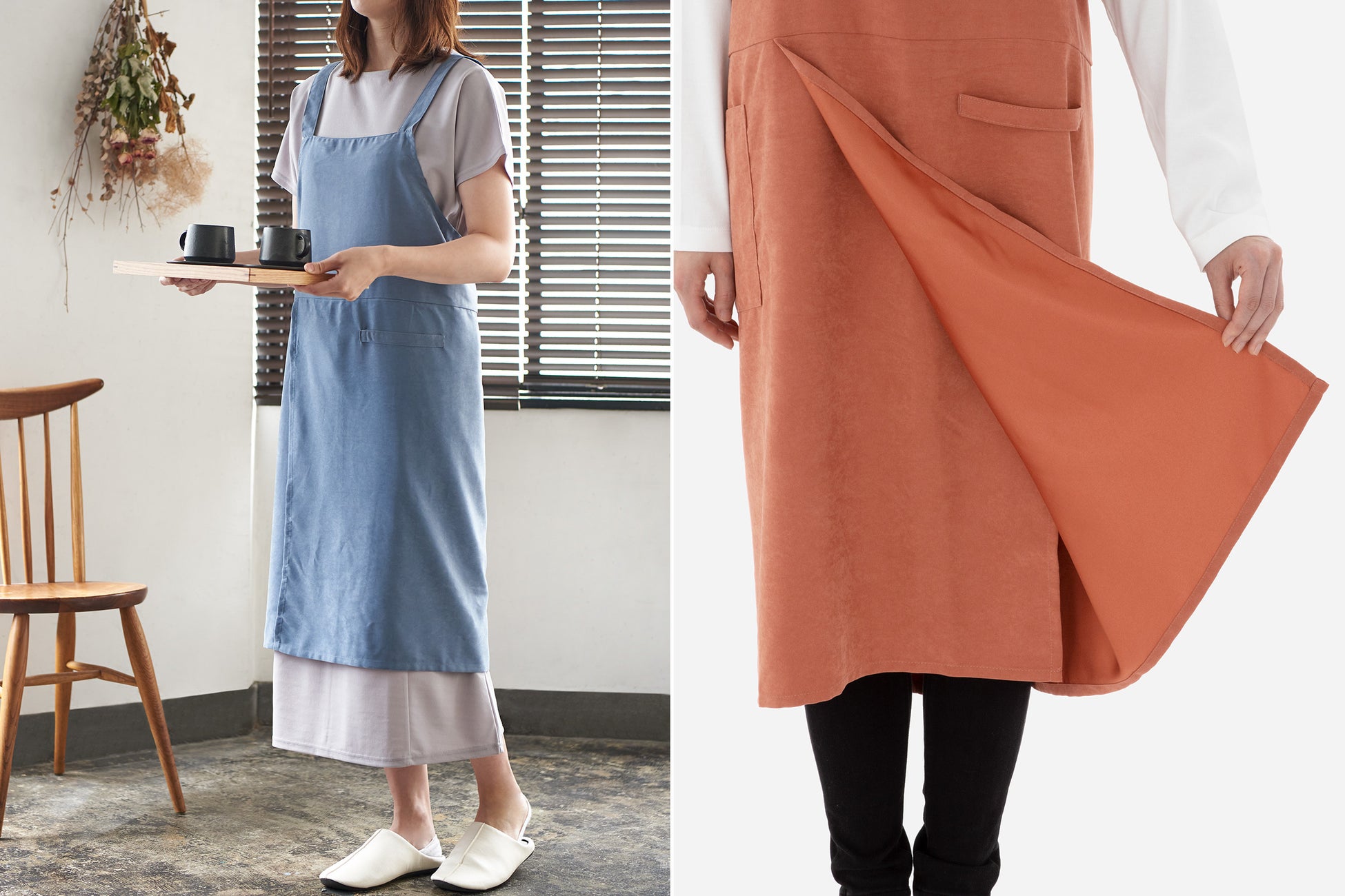 また、アパレルアイテムも手掛けるブランドとして、普段のコーディネートにも馴染み、羽織ったままコンビニやスーパーなどへ買い出しへ行けるようなファッション性も両立しました。自宅でのご使用はもちろんのこと、お料理教室や、ギフトとしてもおすすめです。
