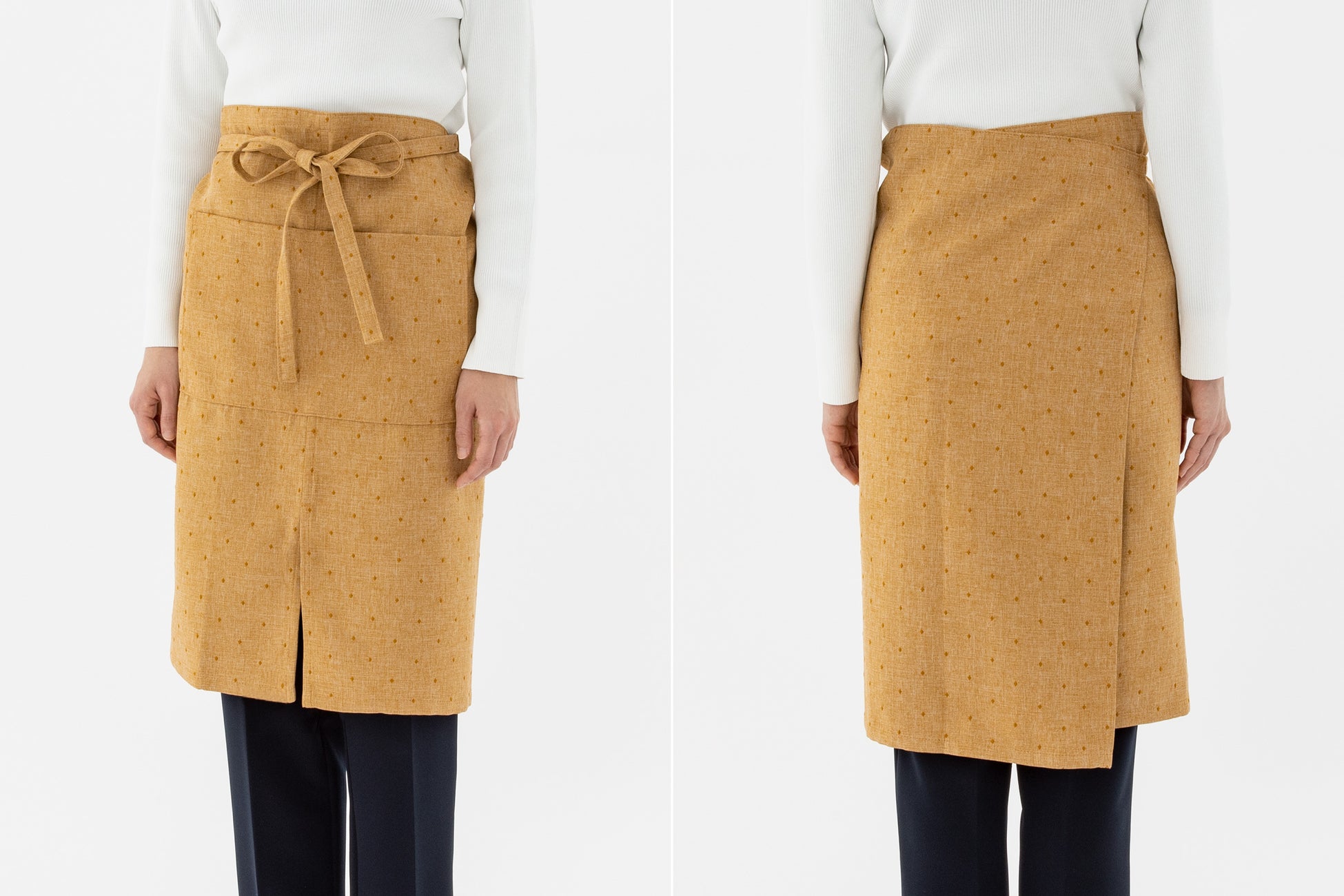 「洗い物をする際の水ハネが気になる」という声に着目し、腹部から下部分の生地を重ねることで、水に濡れても服までしみにくいようにしました。また、レイヤード部分はラップスカートを参考にし、機能性だけではなくデザインにもこだわって仕上げました。ラップ状にすることにより、スリットの役目も果たすため、足の動きも邪魔しない仕様なのも嬉しいポイントです。