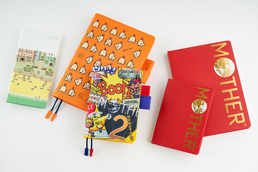 2024年版で10年目となった『MOTHER』シリーズは、新作の手帳が過去最多のラインナップで全5種類。新作の手帳カバーやweeksの他、「ほぼ日手帳HON」でも初登場。今年のおまけは『MOTHER2』のクリアステッカーです。