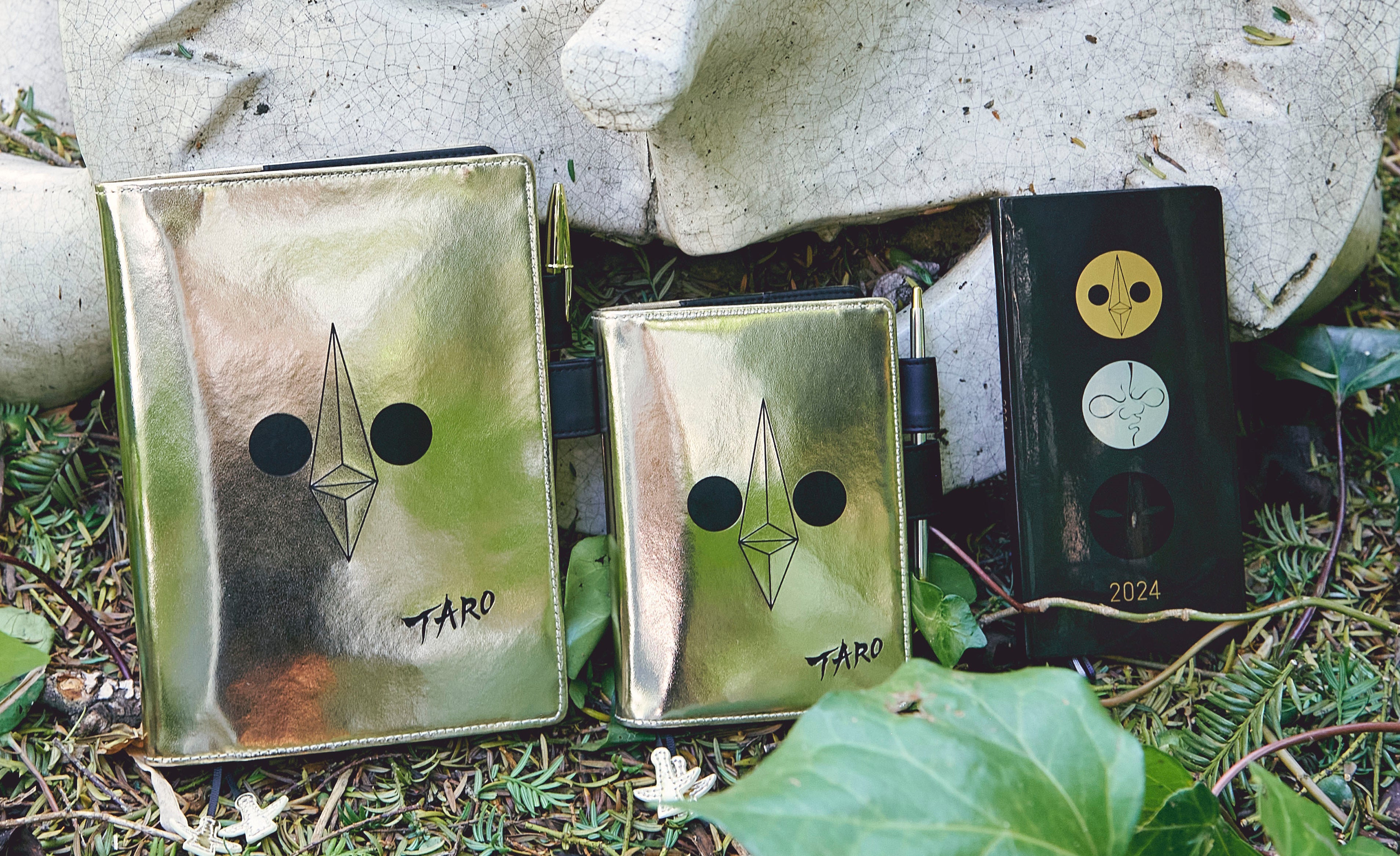 大阪の万博記念公園にそびえ立つ、岡本太郎の代表作『太陽の塔』。その塔のてっぺんで輝く「黄金の顔」をデザインした手帳カバーと、正面の「太陽の顔」、背面の「黒い太陽」を加えた3つの顔を並べたweeksが登場します。
