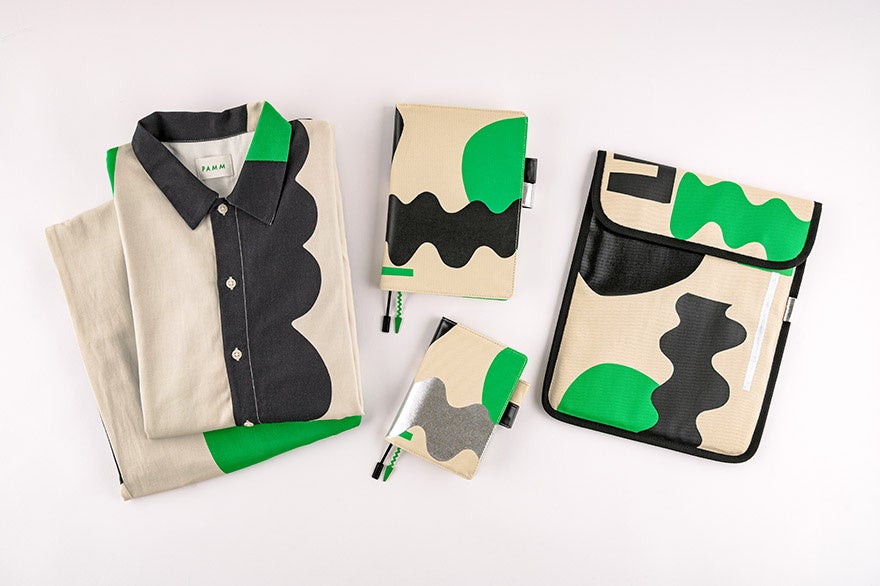 パジャマを「本当にひとり」のときに着る服ととらえ、魅力的で上質なパジャマを生み出すブランド『PAMM』と、手帳カバーとPCケースをつくりました。デザインのモチーフとなったのは、実際にPAMMで販売されている「寛大なインテリアのパジャマ」。クリーム色のコットン地に、グリーン、ブラック、シルバーの有機的な図形が配置された、ポップなデザインです。
