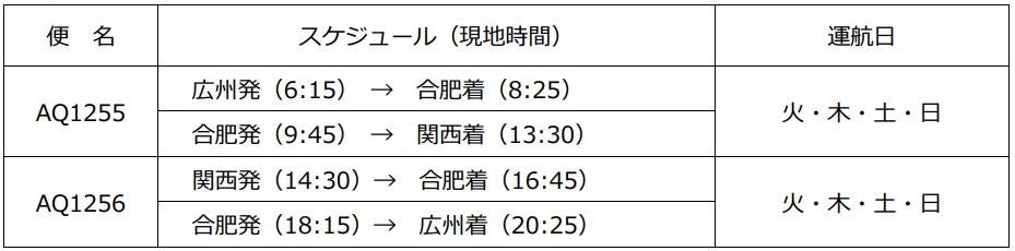 関西エアポート株式会社は、九元航空(AQ)が2025年6月3日(火)から関西=臨沂線を新規就航し週3便(火・木・土)で運航を開始、2025年6月21日(土)から関西=合肥線の運航を週4便(火・木・土・日)で開始することをお知らせします。