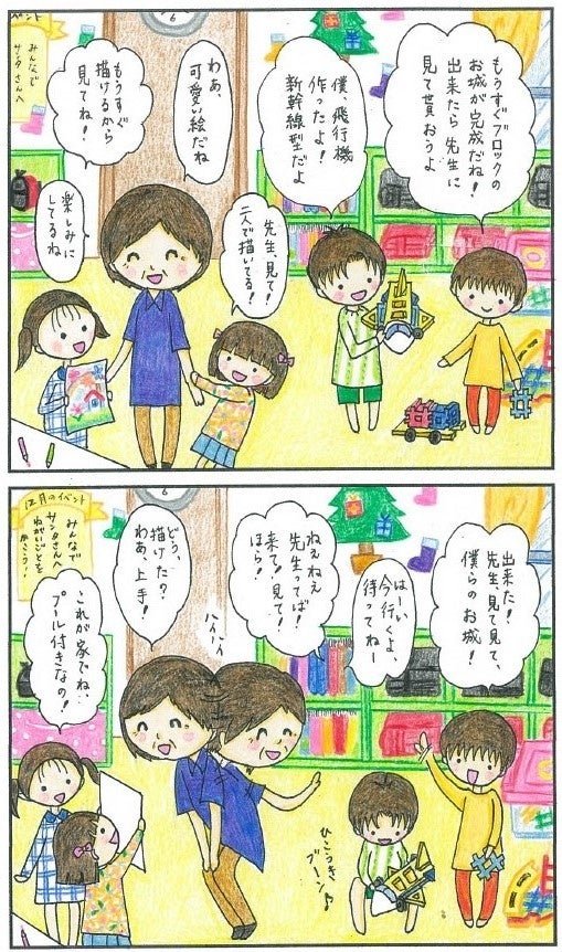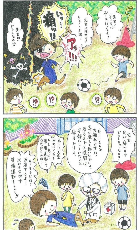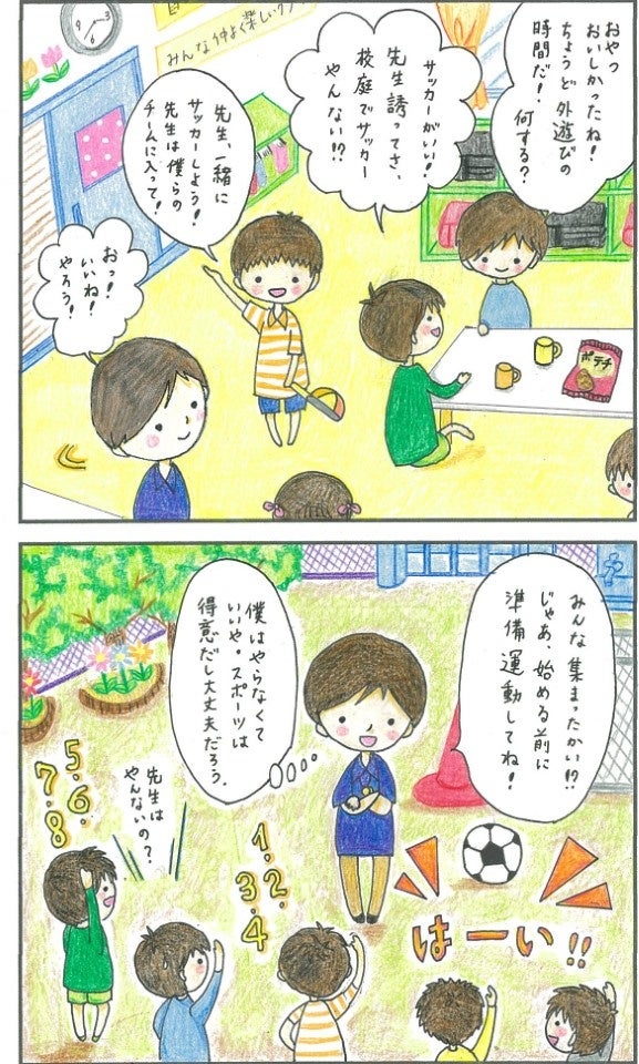 「無事故デー」の取り組みとして、明日葉が運営する学童で働く石山 芙美奈さんが、労災4コマ漫画を描きました。発生件数が多い労災事故事例を題材に、漫画で分かりやすく注意喚起します。毎月新しい事例を取り上げることで、全国の事業所で同じような事故が起こらないように徹底します。