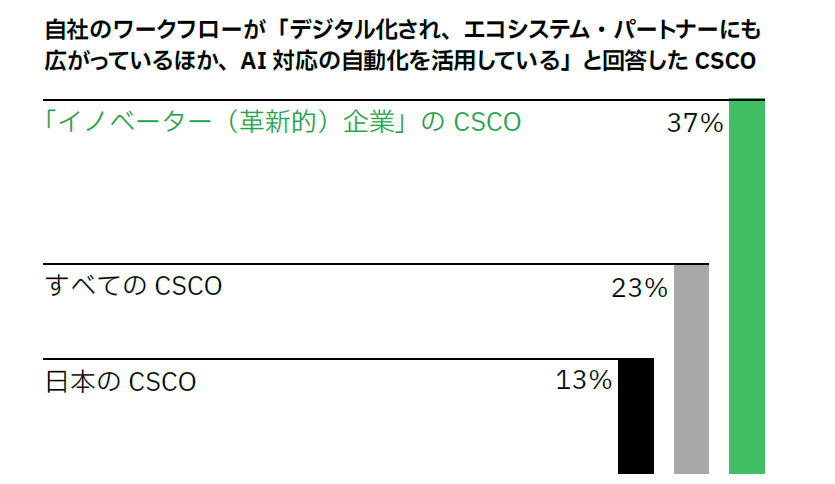 - イノベーター企業はワークフローの自動化・統合化を自社およびエコシステム全体に広げているが、日本企業の取り組みは遅れている