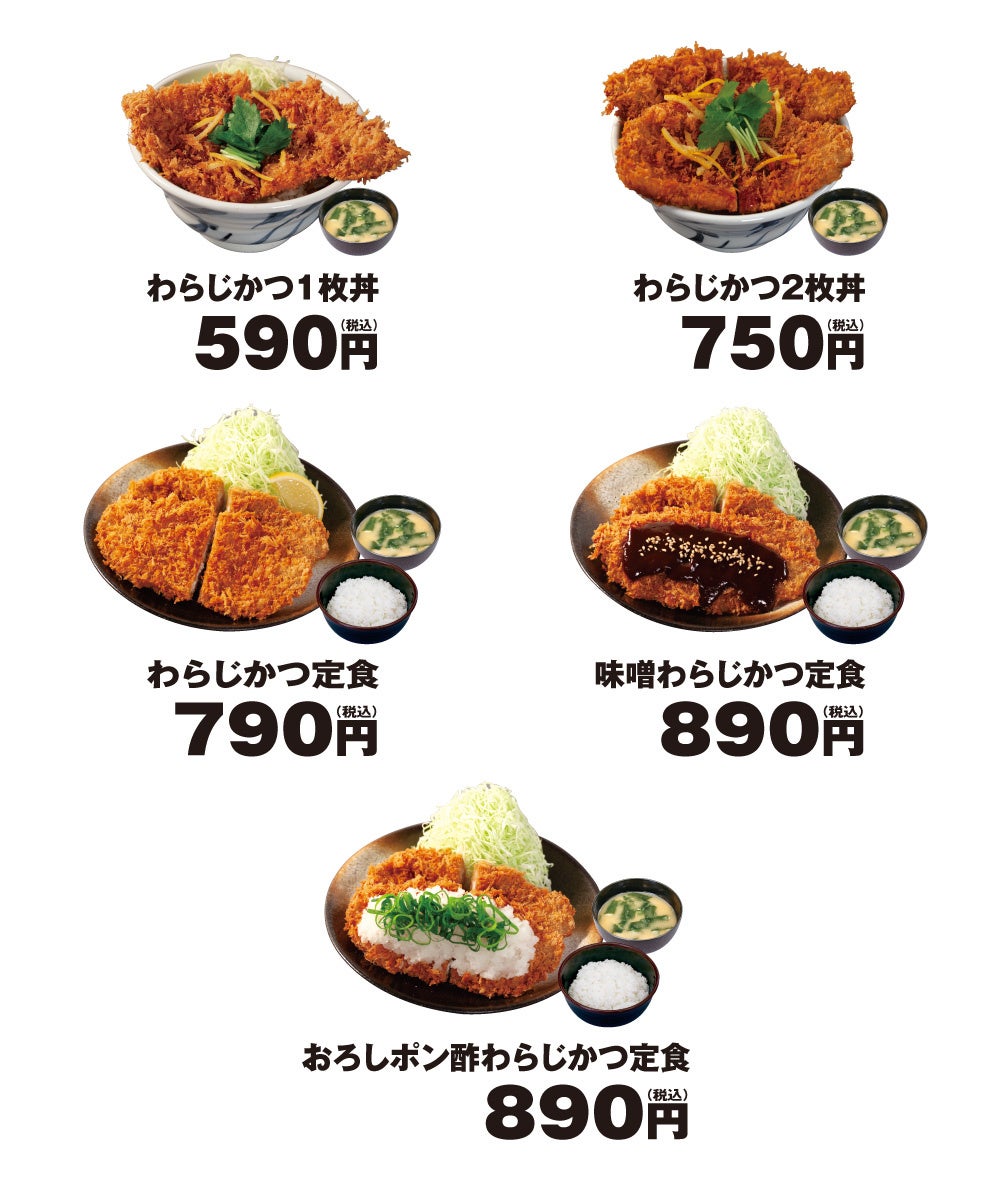 | 商品名 わらじかつ丼(みそ汁付) (1枚丼)590円 (2枚丼)750円 わらじかつ定食(ライス・みそ汁付) 790円 おろしポン酢わらじかつ定食(ライス・みそ汁付) 890円 味噌わらじかつ定食(ライス・みそ汁付) 890円 単品わらじかつ 280円 ※お持ち帰りのみそ汁は、別途60円でお買い求めいただけます。 ※全て税込価格です。 発売日 2022年3月16日(水)午後3時~ 対象店舗 とんかつ専門店132店舗 下記URLよりご参照ください。 URL: https://bit.ly/35q2K58 |