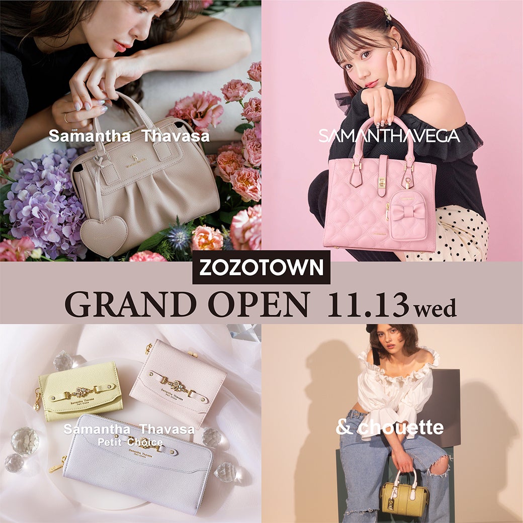 株式会社サマンサタバサジャパンリミテッド(代表取締役社長:古屋 幸二、所在地:東京都港区)は『Samantha Thavasa』『SAMANTHAVEGA』『Samantha Thavasa Petit Choice』『& chouette』の4 ブランドをZOZOTOWNにて11/13(水)にグランドオープンいたします。
