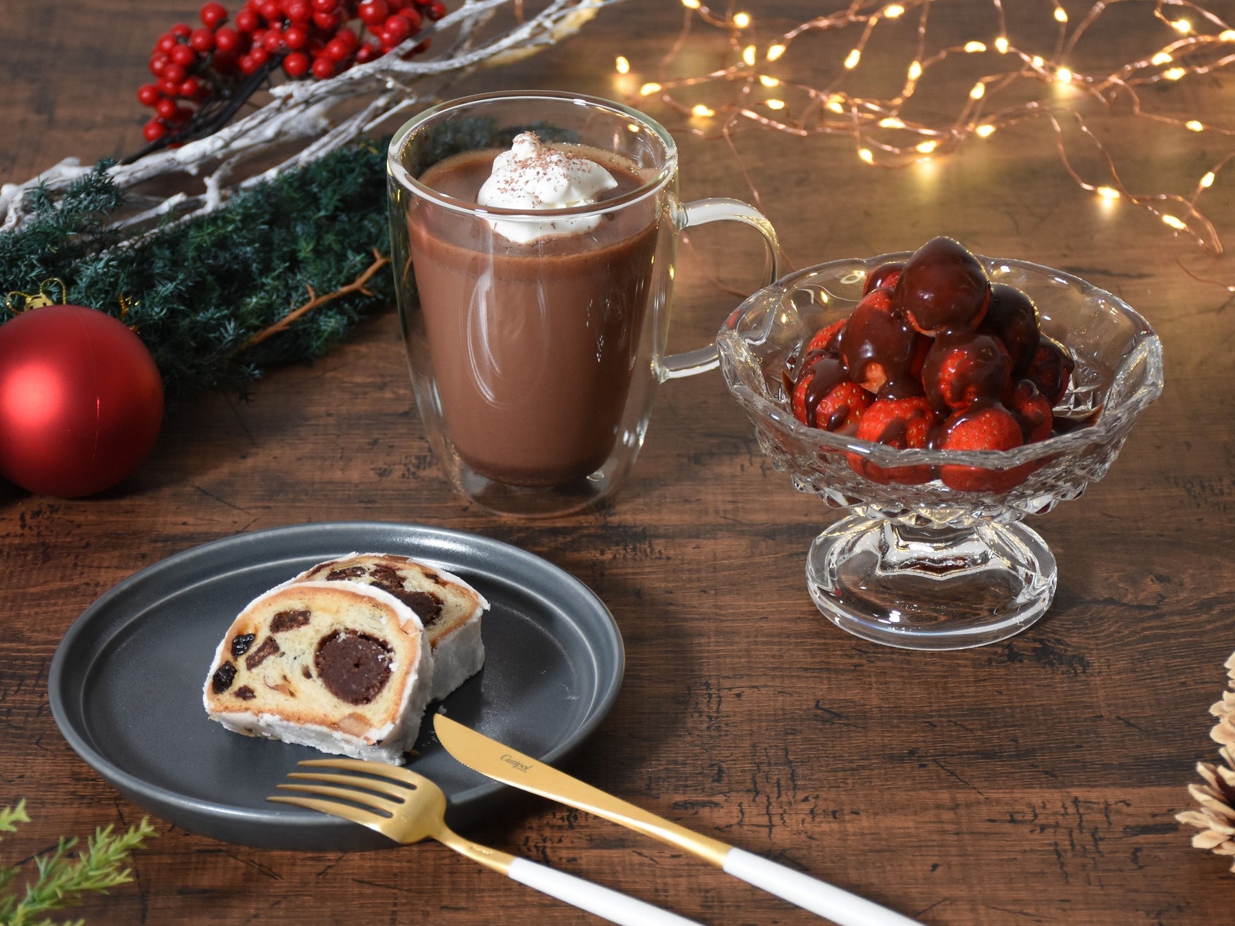 麻布台ヒルズでチョコレートのコースを提供している、国際品評会2位という高い評価を受けるチョコレート専門店。昨年も大好評だったホットチョコレートはリッチで濃厚なのに軽やかで飲みやすい味わいです。お客様の目の前でチョコレートをかけて提供するクリスマスマーケット限定の新作、チョコレートストロベリーもぜひご賞味ください。